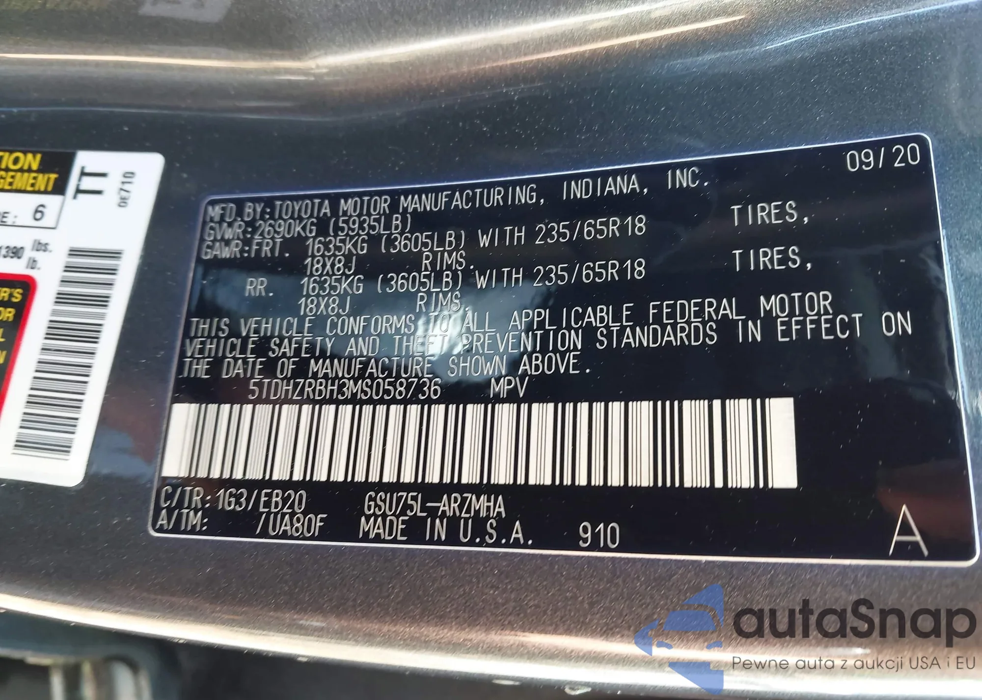 LOT: 42224348 VIN: 5TDHZRBH3MS058736