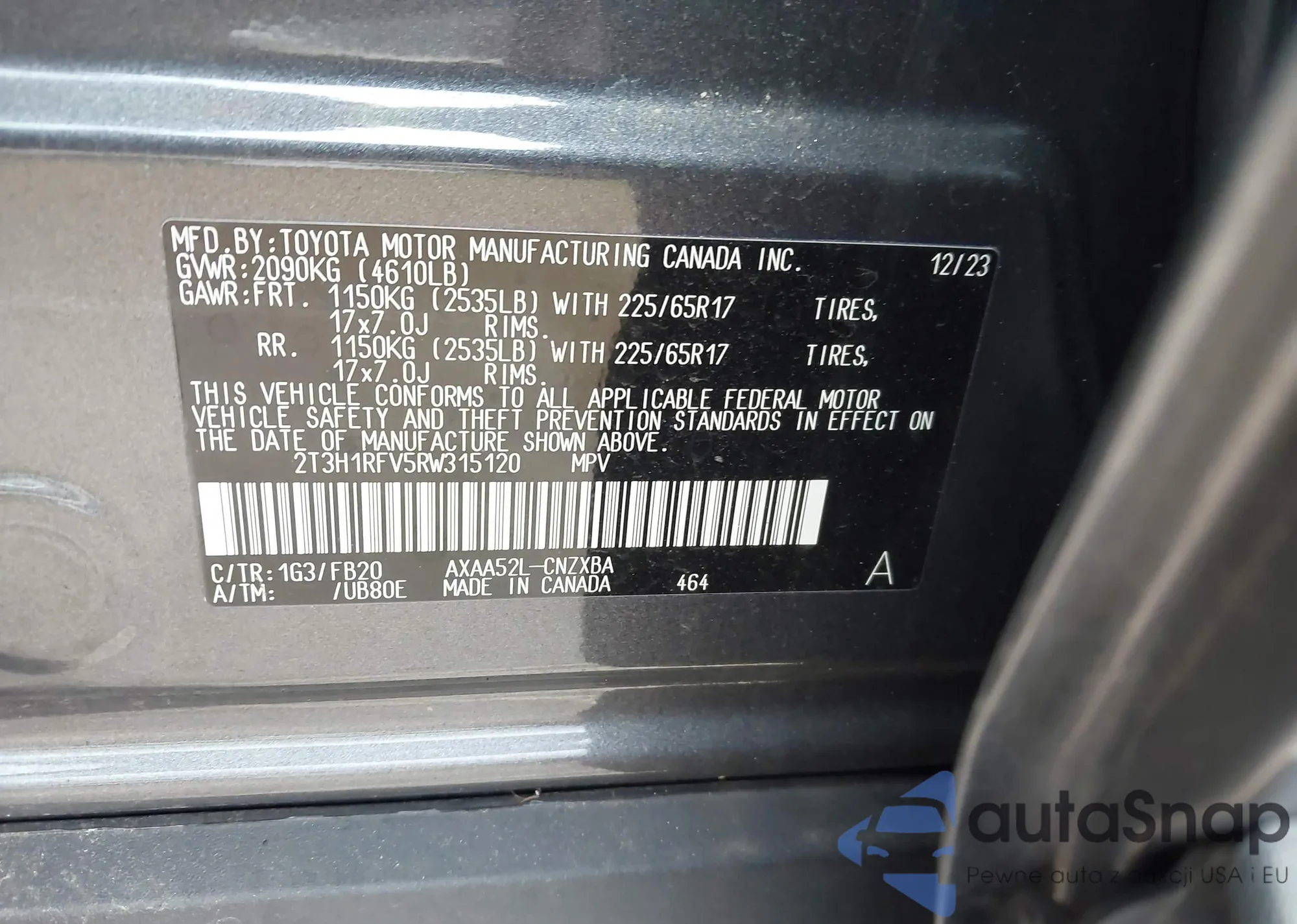 • VIN 2T3H1RFV5RW315120