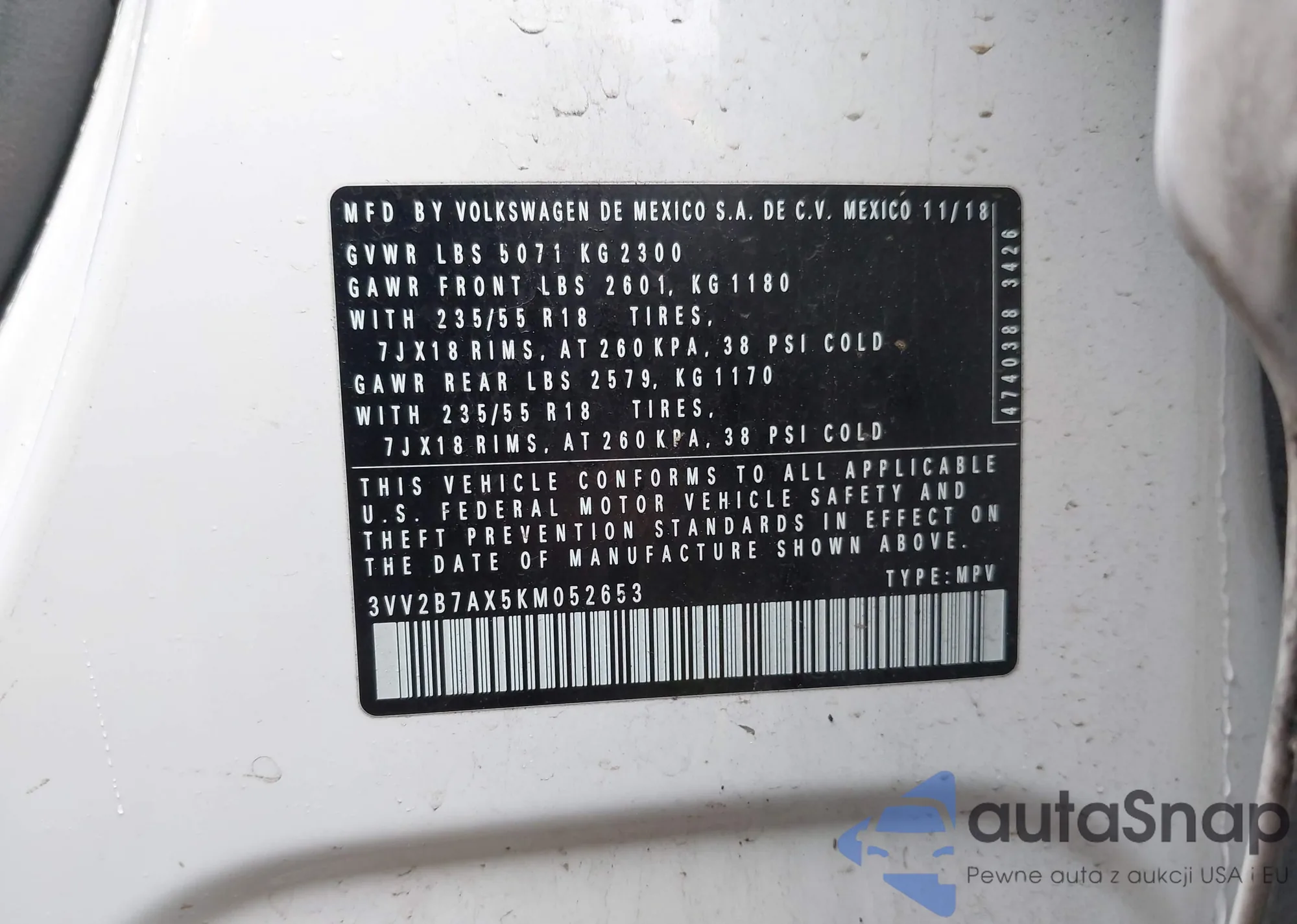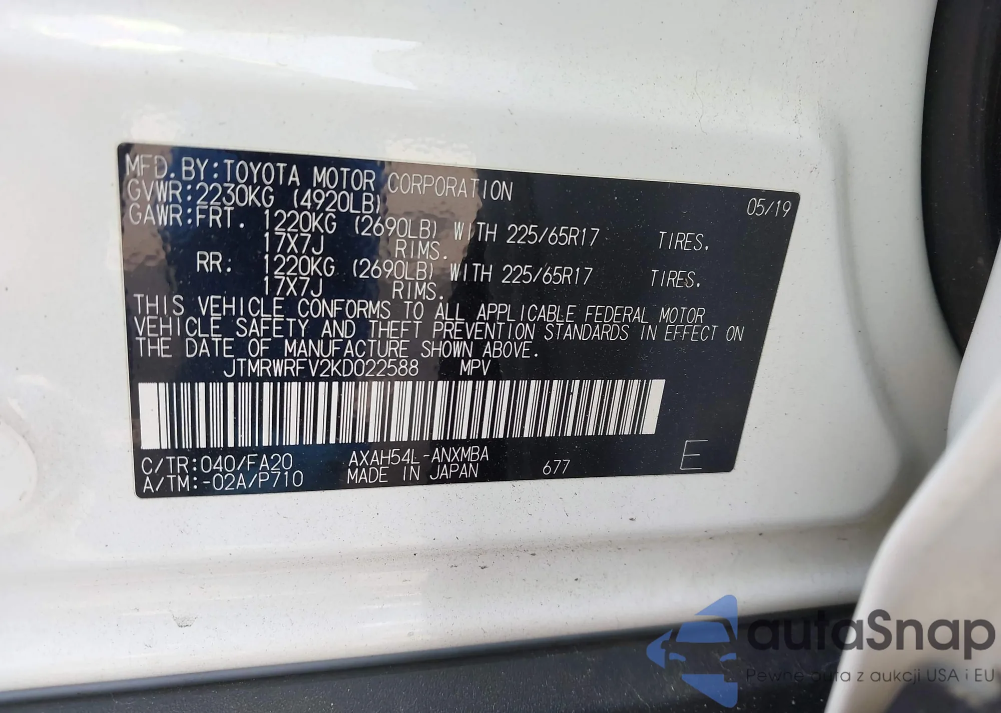 LOT: 42072535 VIN: JTMRWRFV2KD022588