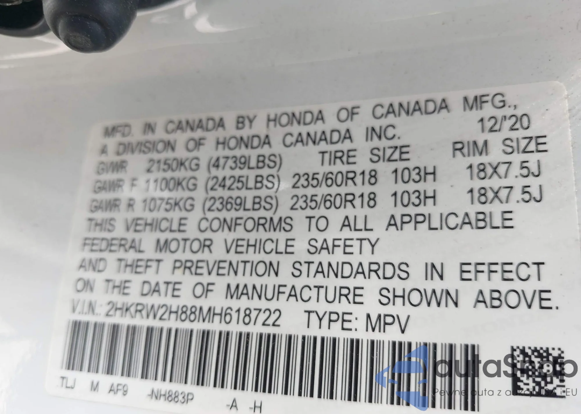 • VIN 2HKRW2H88MH618722