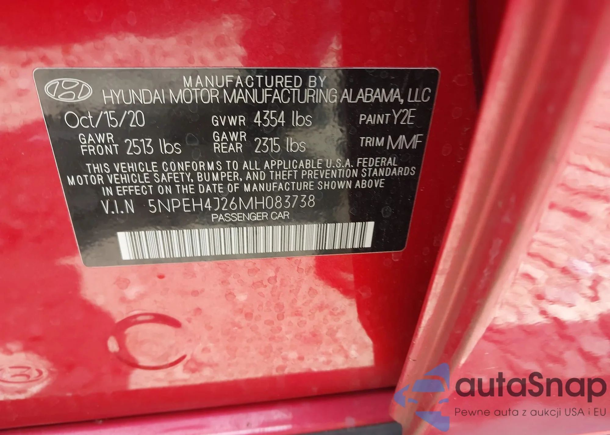 LOT: 42027265 VIN: 5NPEH4J26MH083738