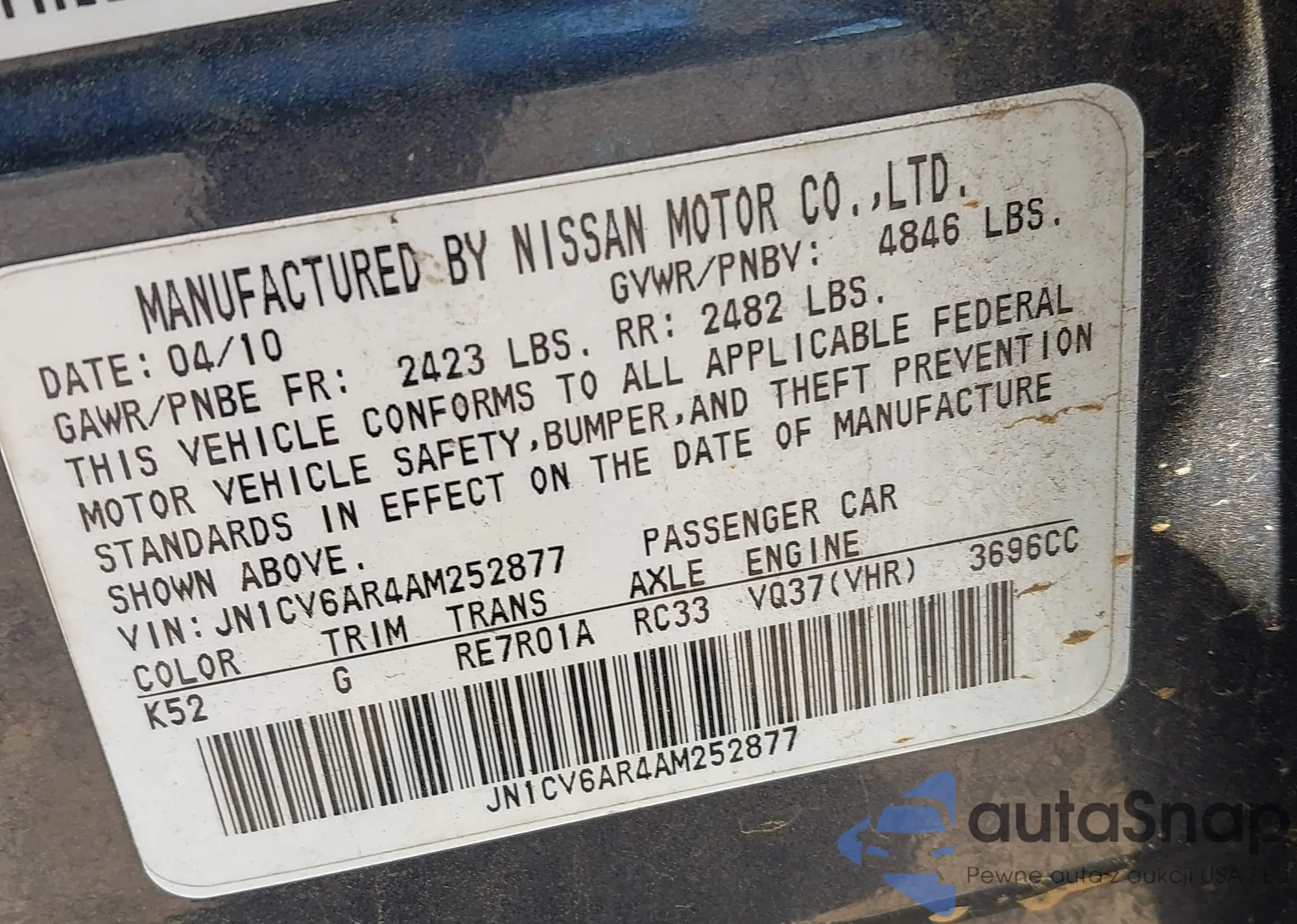 LOT: 42164557 VIN: JN1CV6AR4AM252877