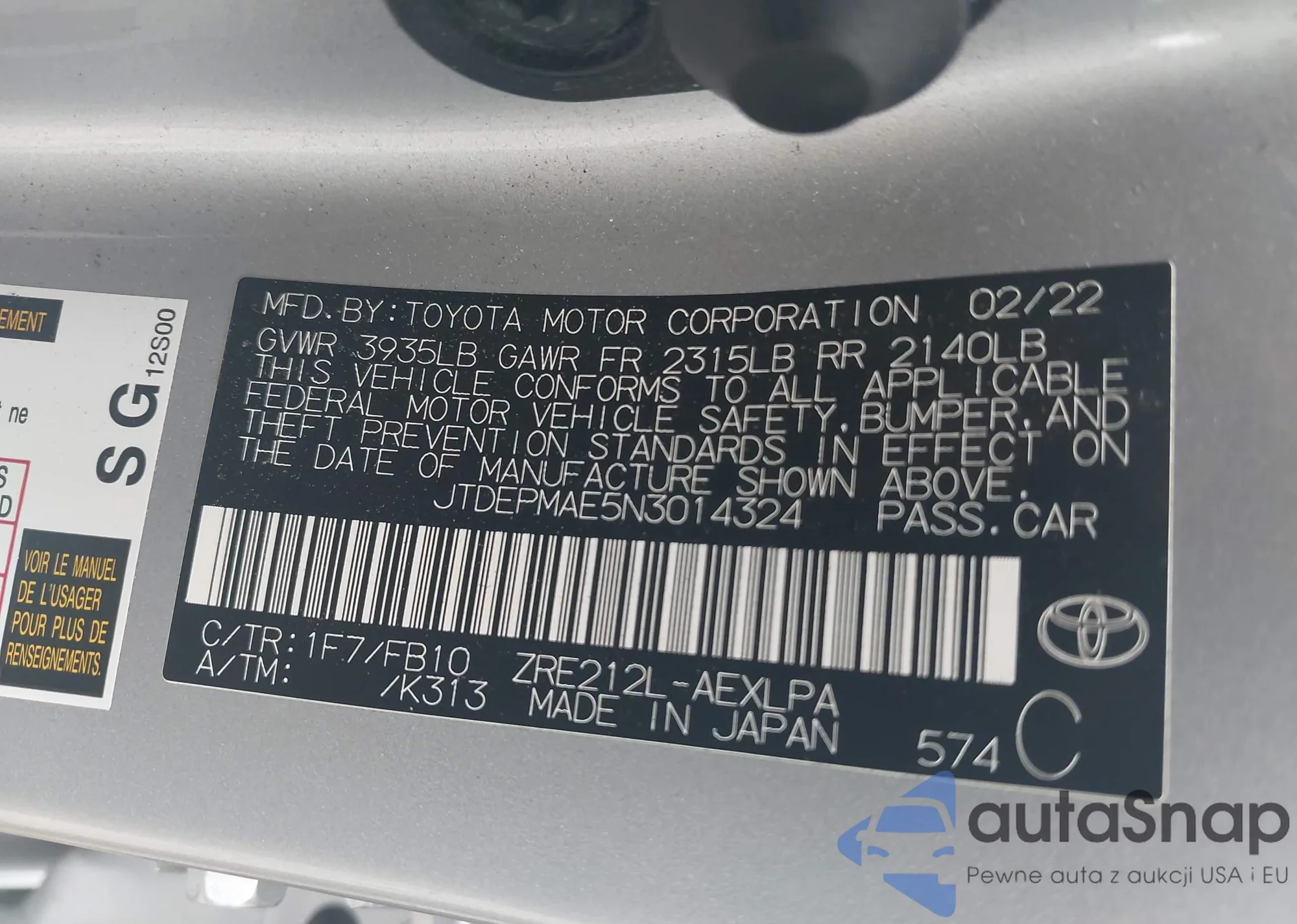 LOT: 42287881 VIN: JTDEPMAE5N3014324