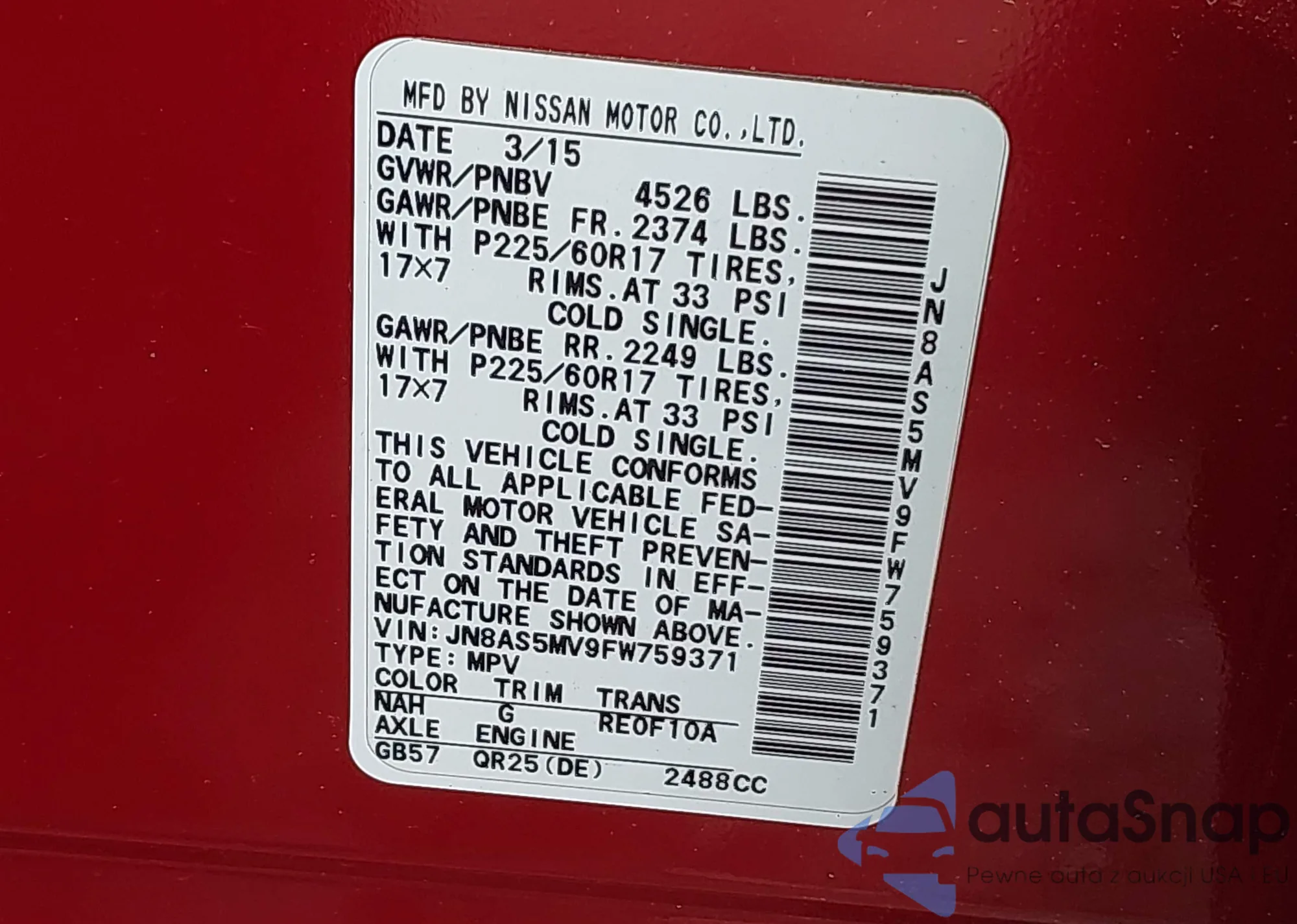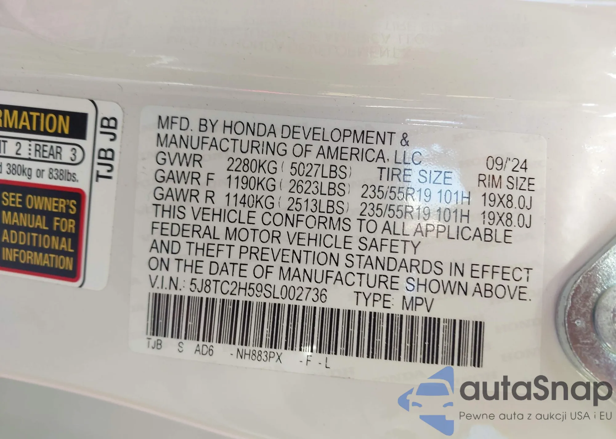 • VIN 5FNRL38875B121076
