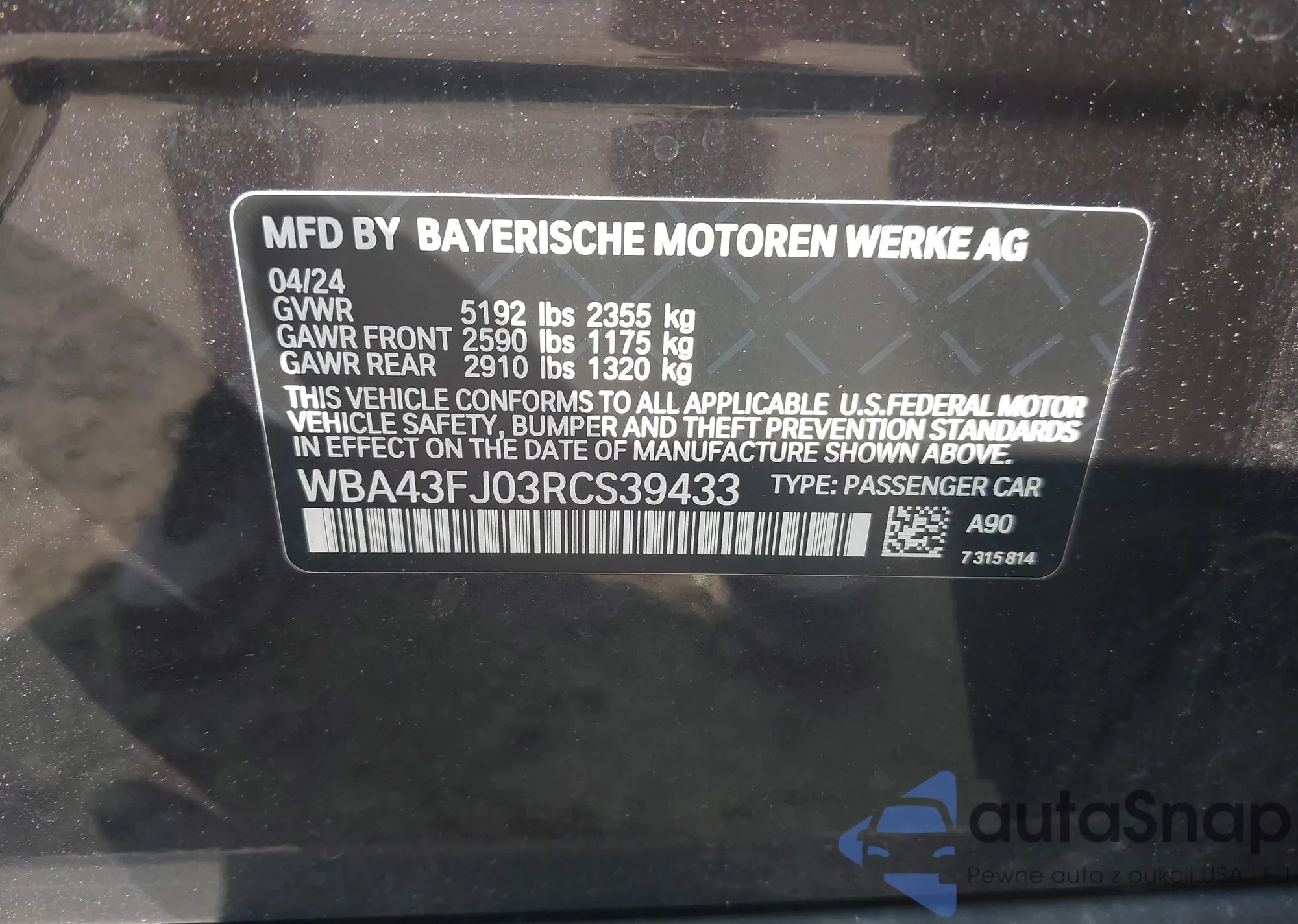 LOT: 42396985 VIN: WBA43FJ03RCS39433