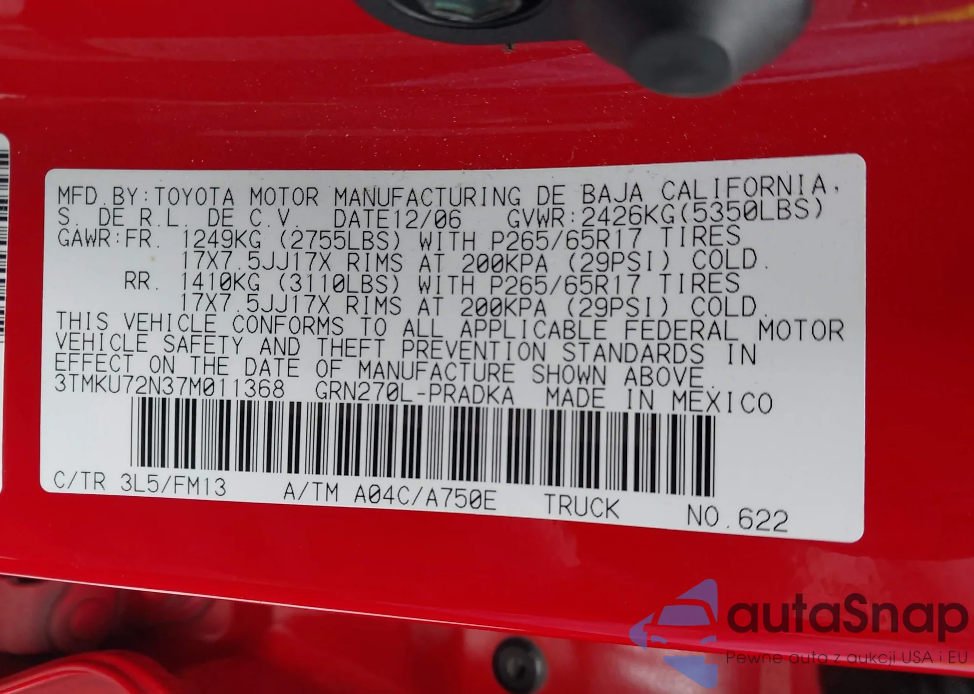 LOT: 42189946 VIN: 3TMKU72N37M011368