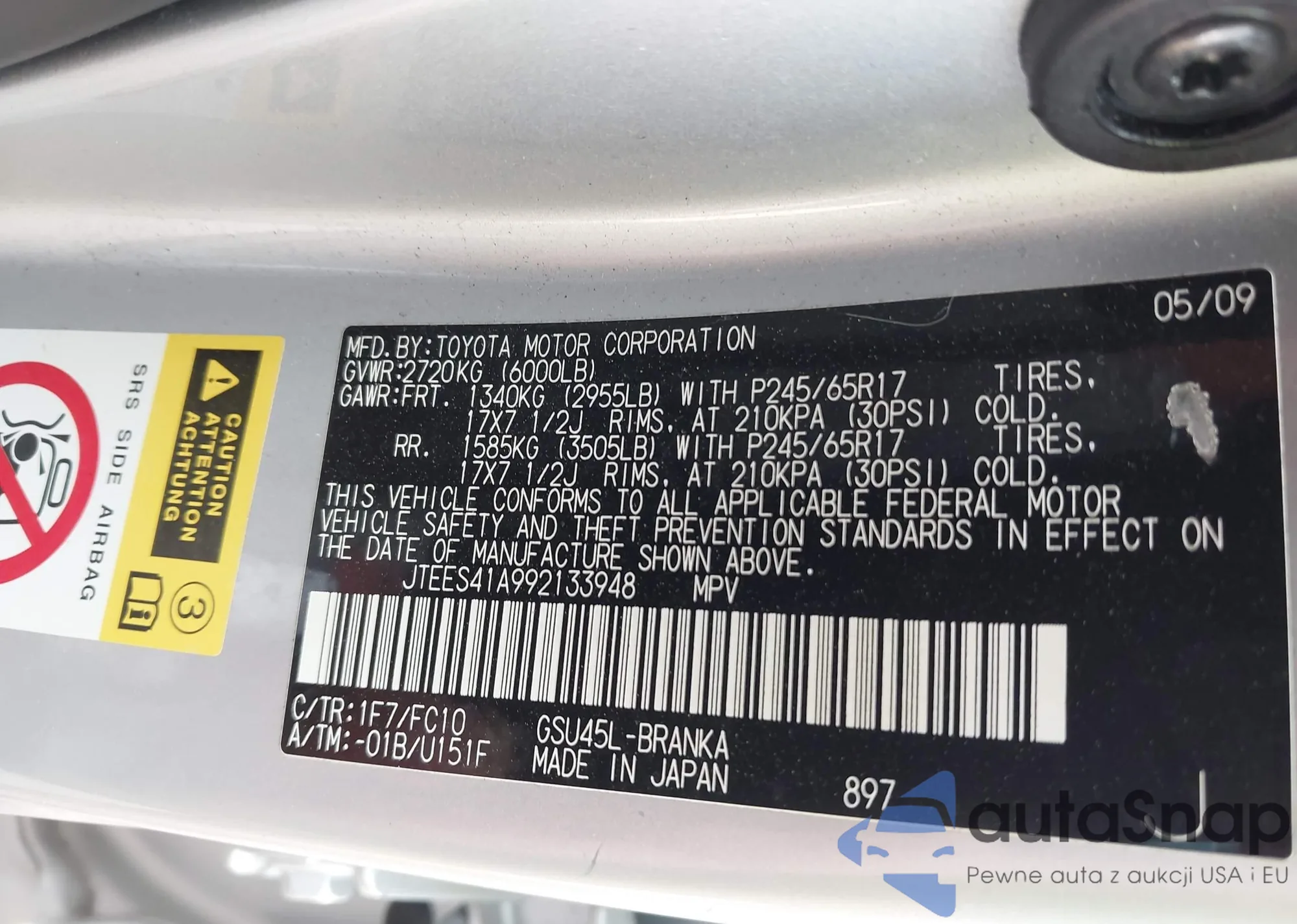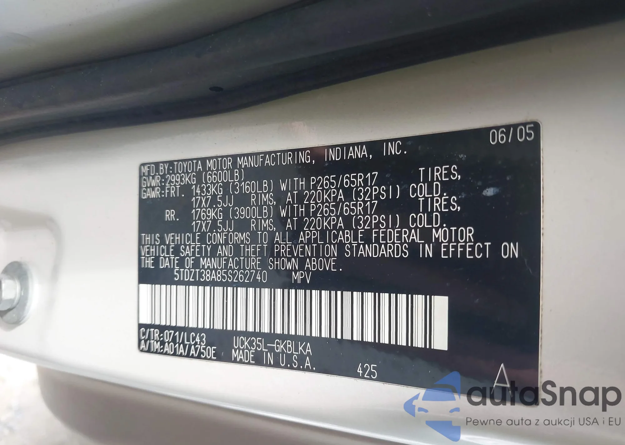 LOT: 42309220 VIN: 5TDZT38A85S262740