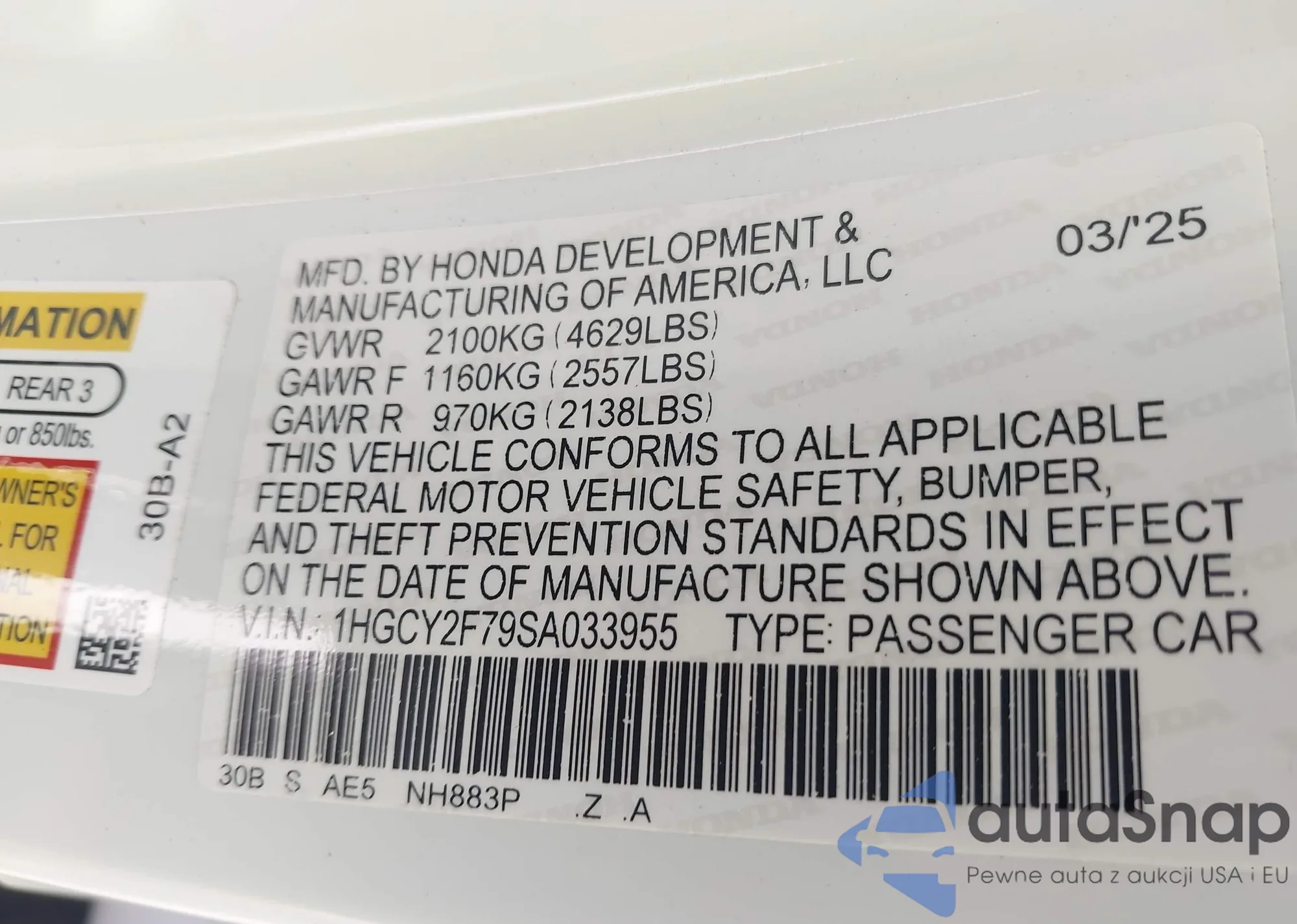 • VIN 1HGCY2F79SA033955