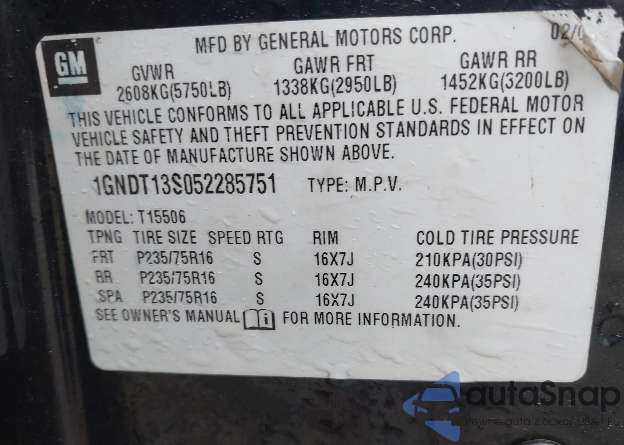 LOT: 42503576 VIN: 1GNDT13S052285751