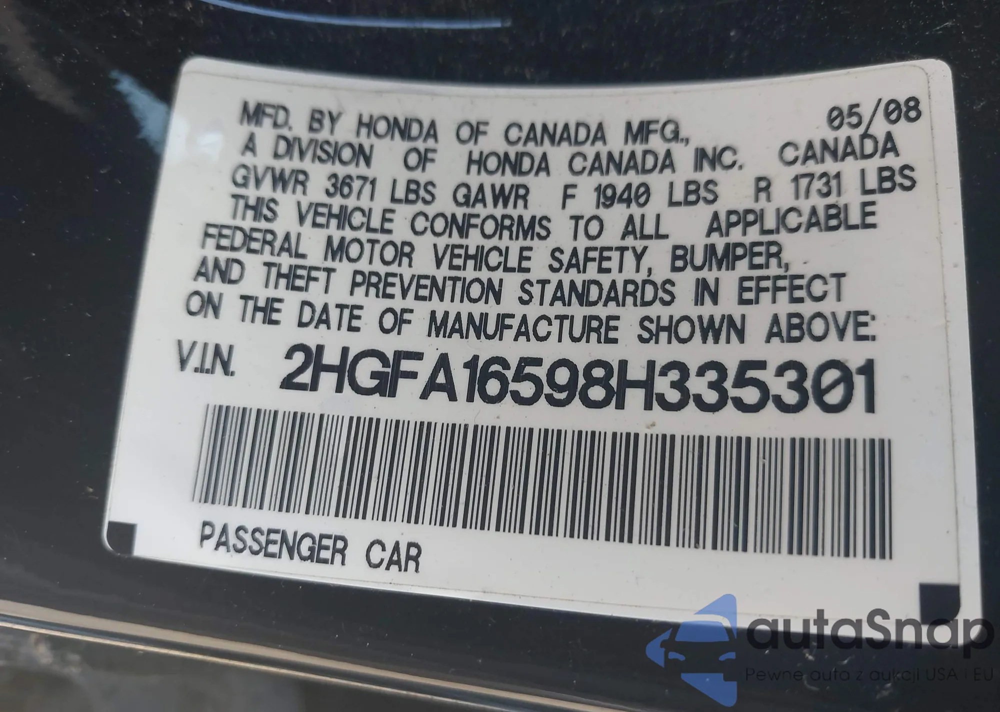 • VIN 2HGFA16598H335301