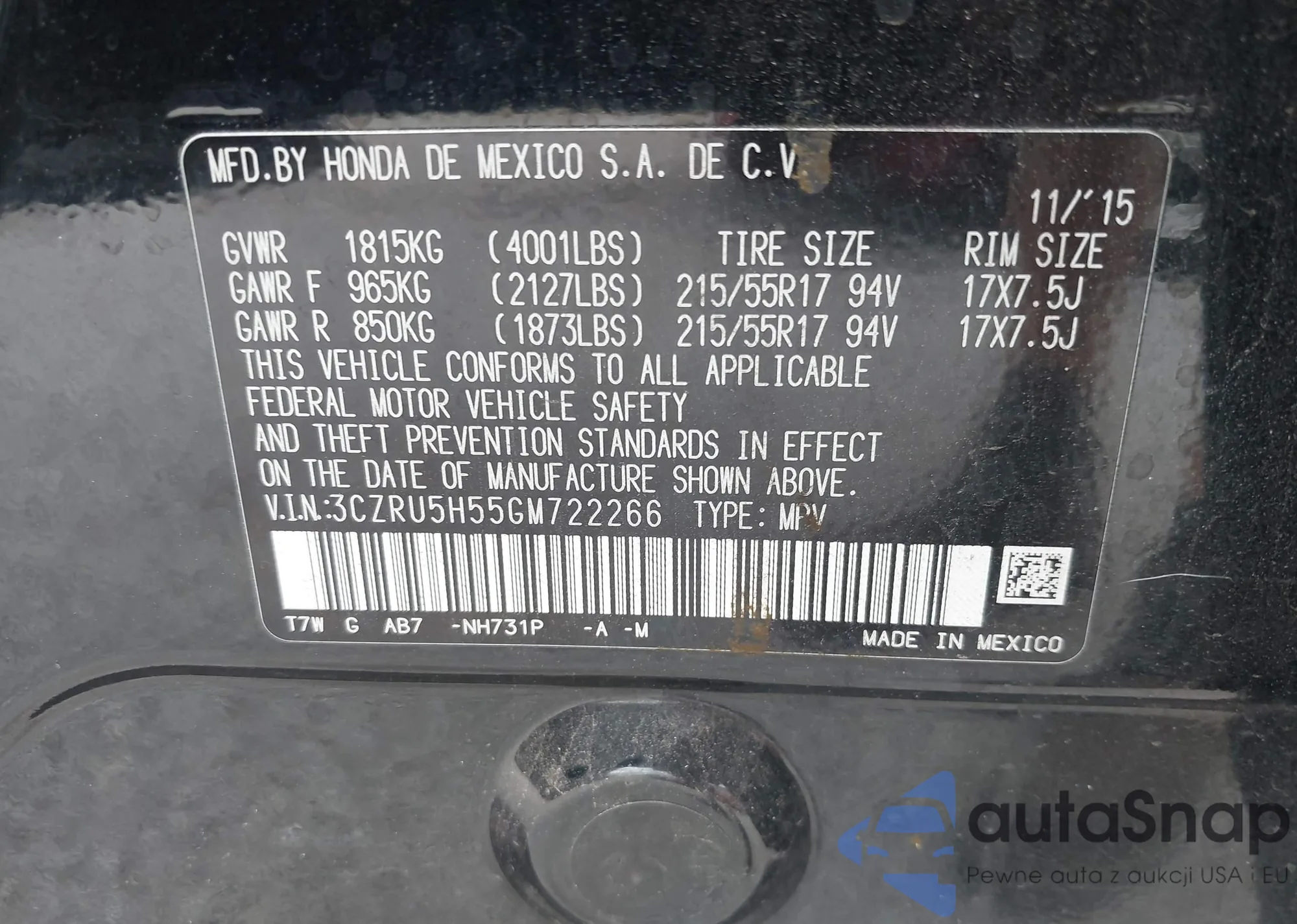 • VIN 3CZRU5H55GM722266