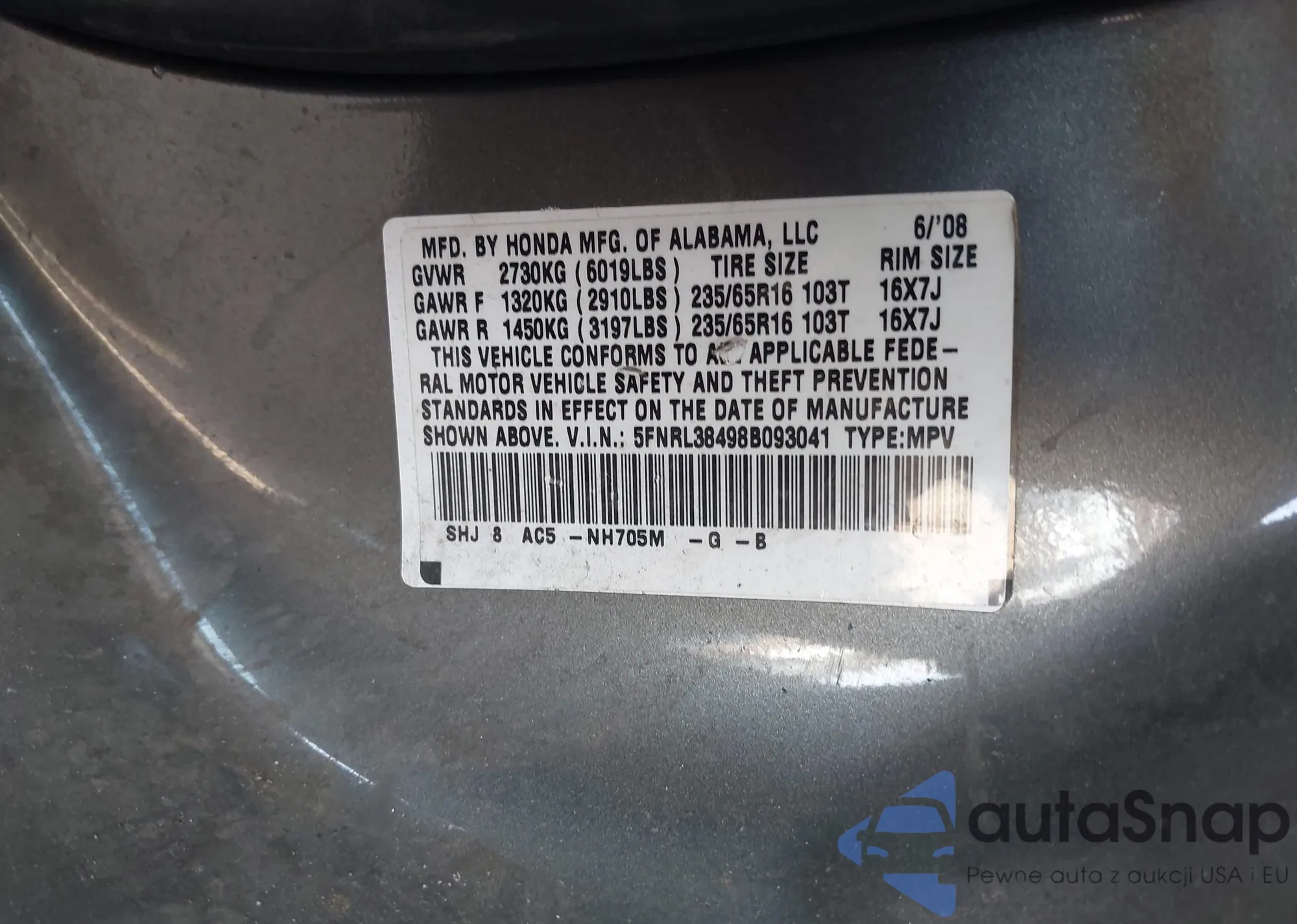 • VIN 5FNRL38498B093041