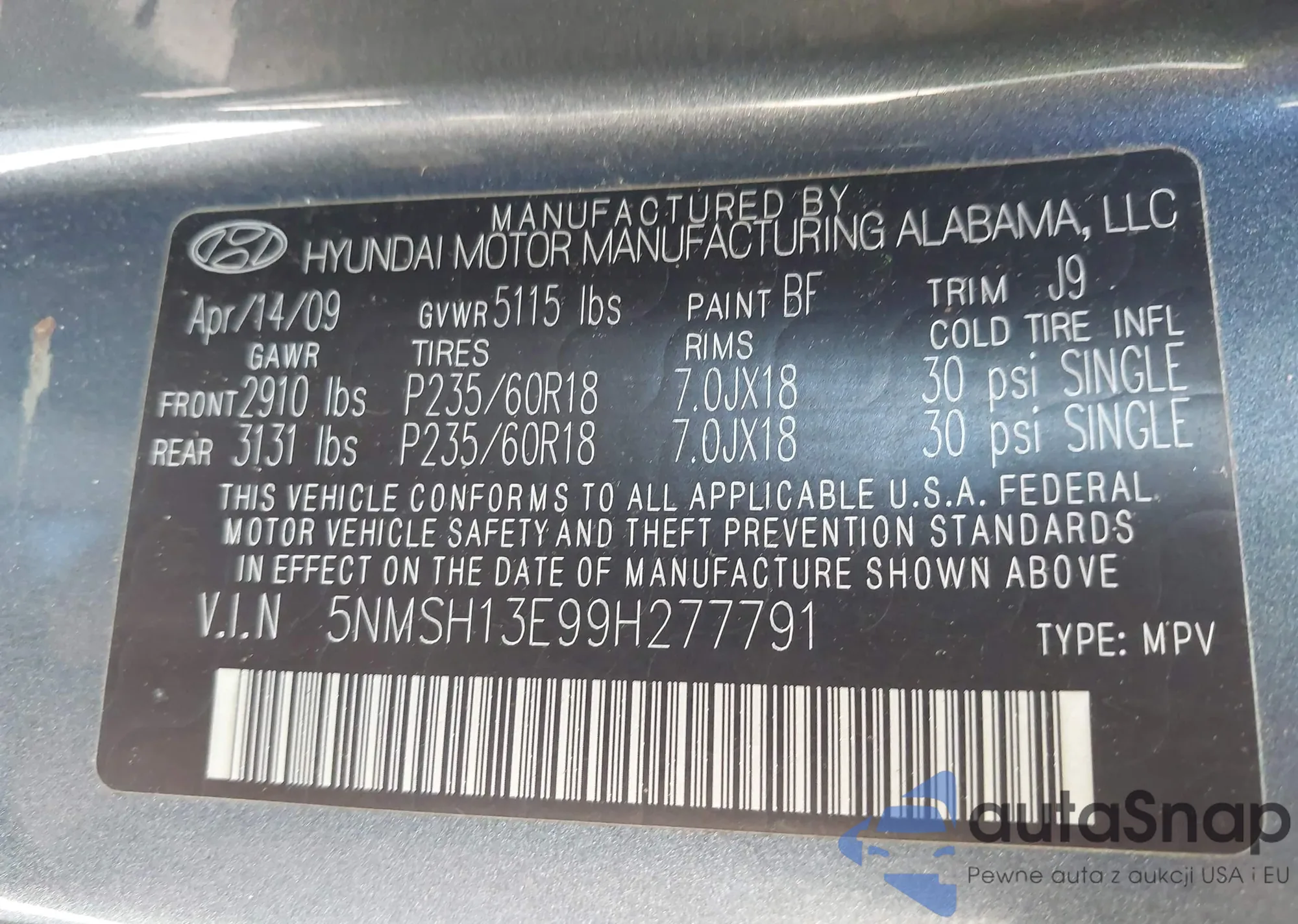 • VIN 5NMSH13E99H277791