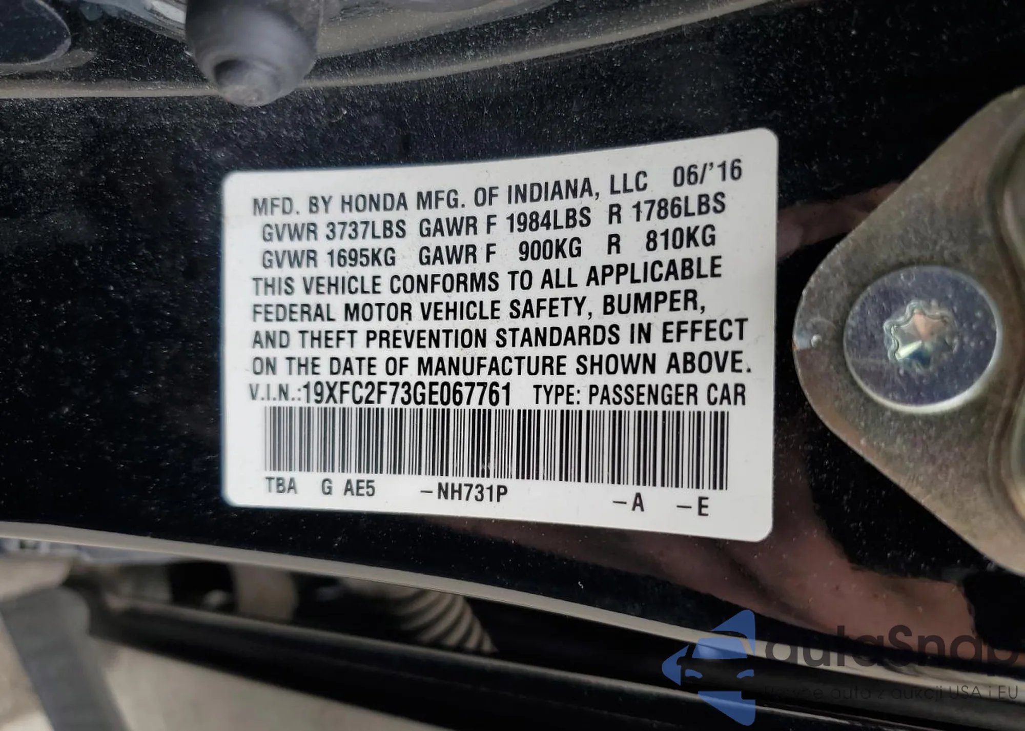 LOT: 56724305 VIN: 19XFC2F73GE067761