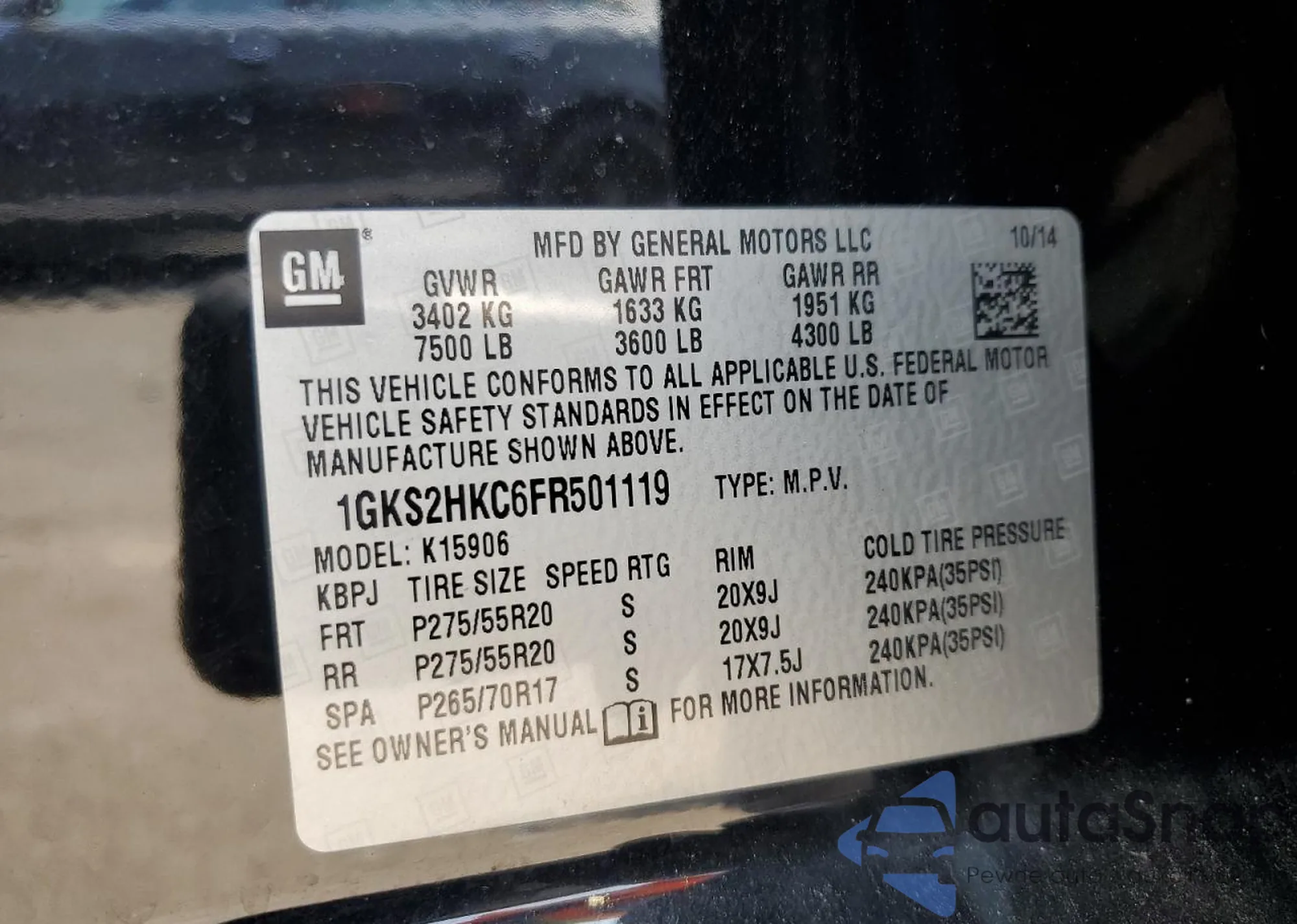 • VIN 1GKS2HKC6FR501119