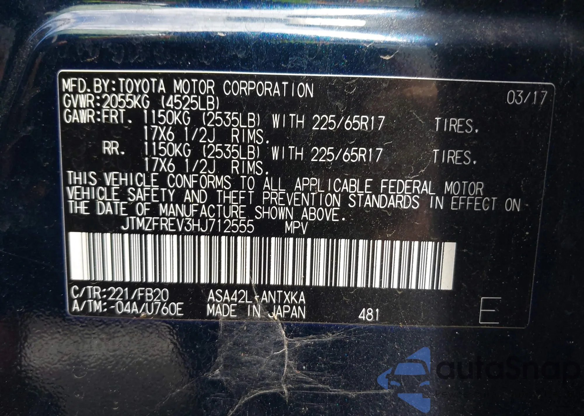 • VIN JTMZFREV3HJ712555
