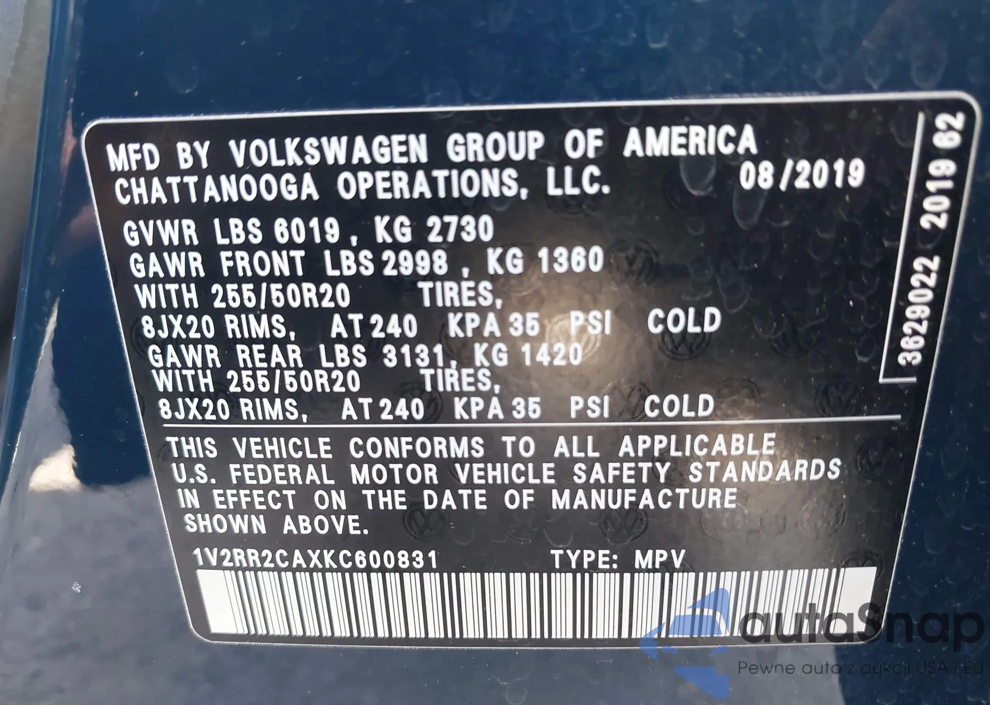 LOT: 42275654 VIN: 1V2RR2CAXKC600831