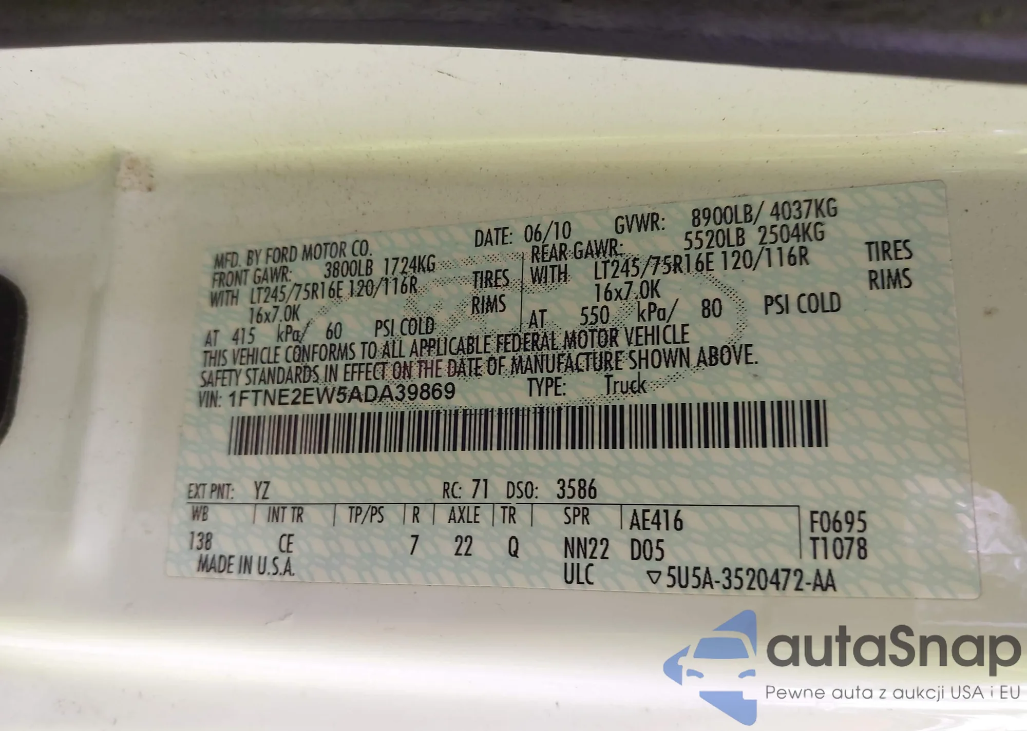 • VIN 1FTNE2EW5ADA39869