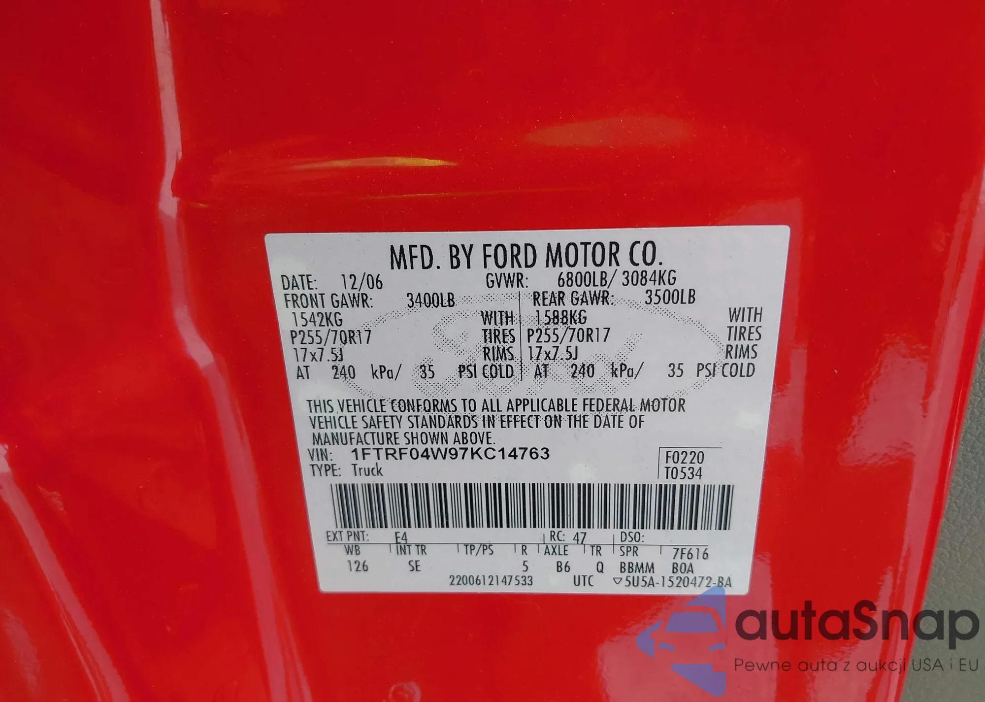 LOT: 42566587 VIN: 1FTRF04W97KC14763