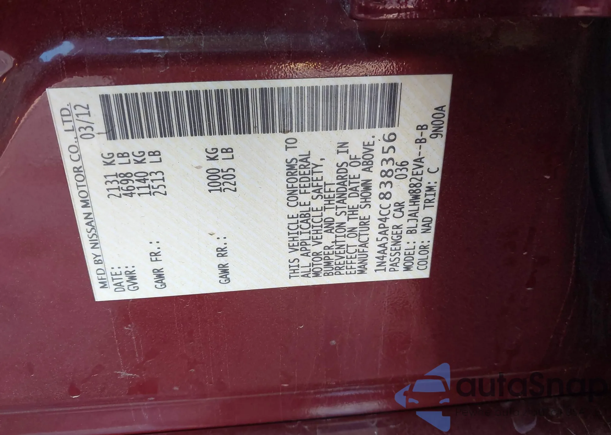LOT: 42528564 VIN: 1N4AL3AP0EC291460