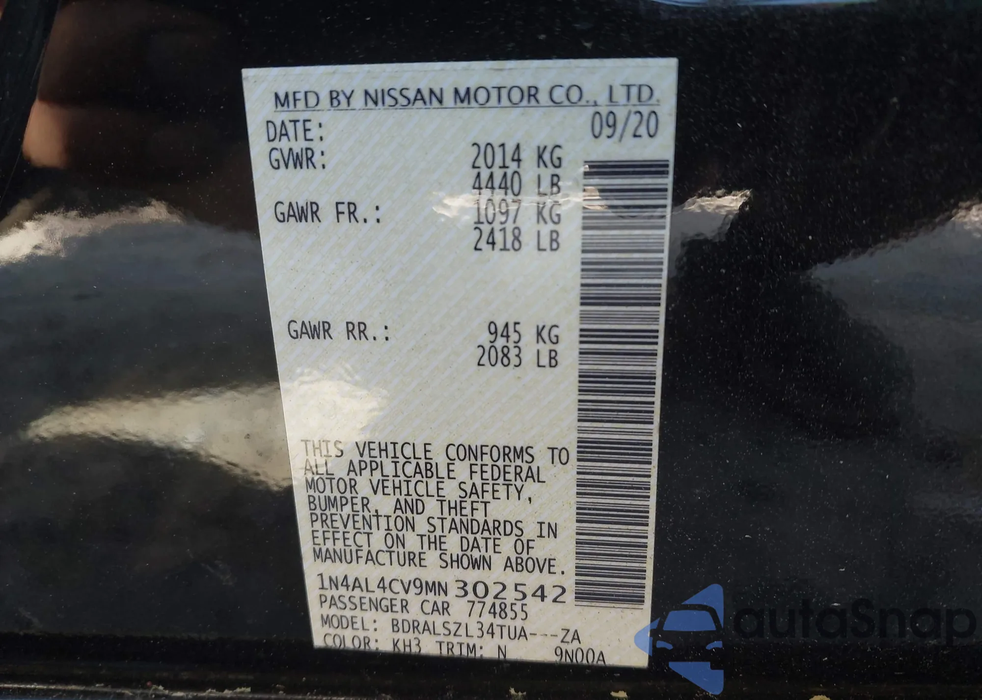 • VIN 1N4AL4CV9MN302542