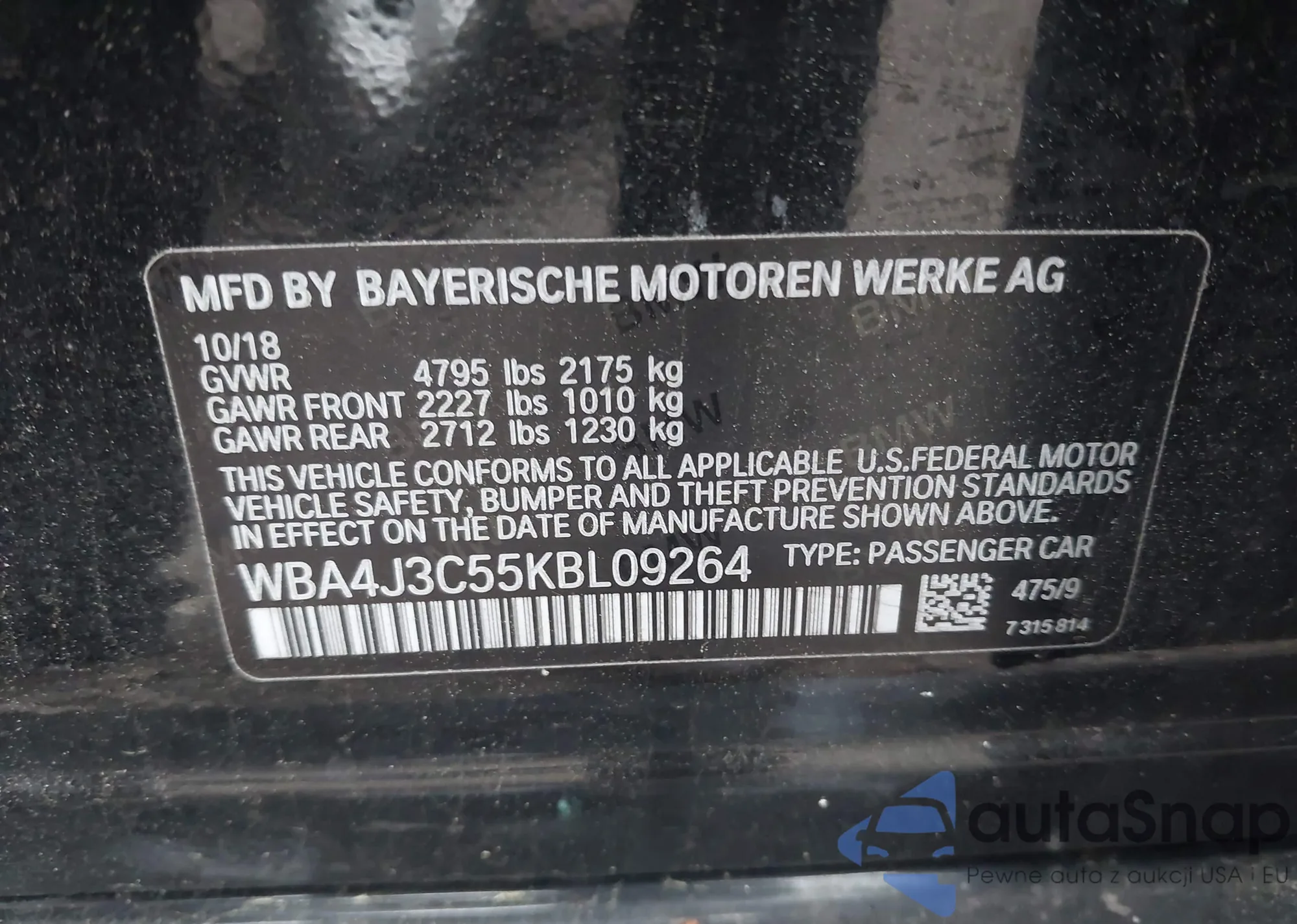 • VIN WBA4J3C55KBL09264