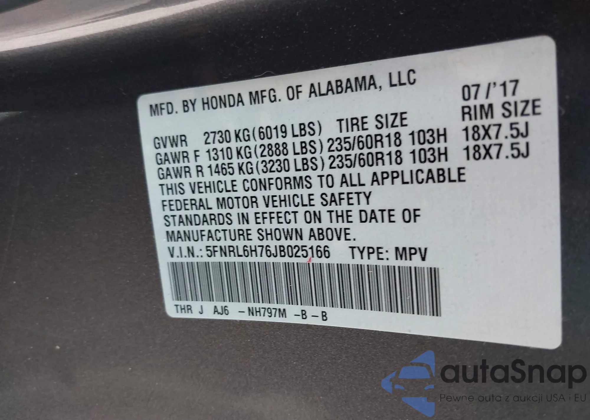 • VIN 5FNRL5H60FB069785