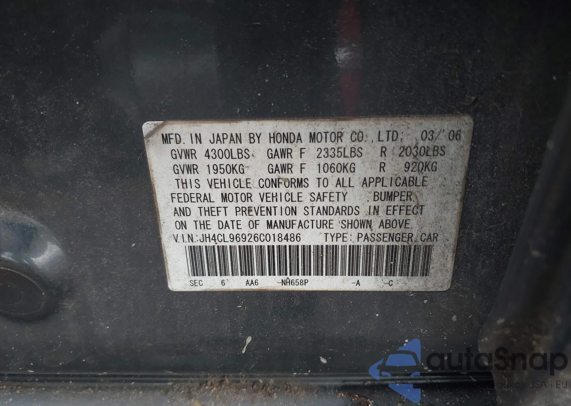 LOT: 42385342 VIN: JH4CL96926C018486