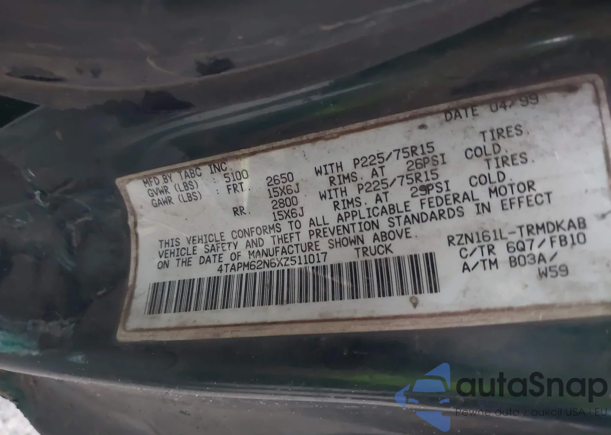 • VIN 4TAPM62N6XZ511017