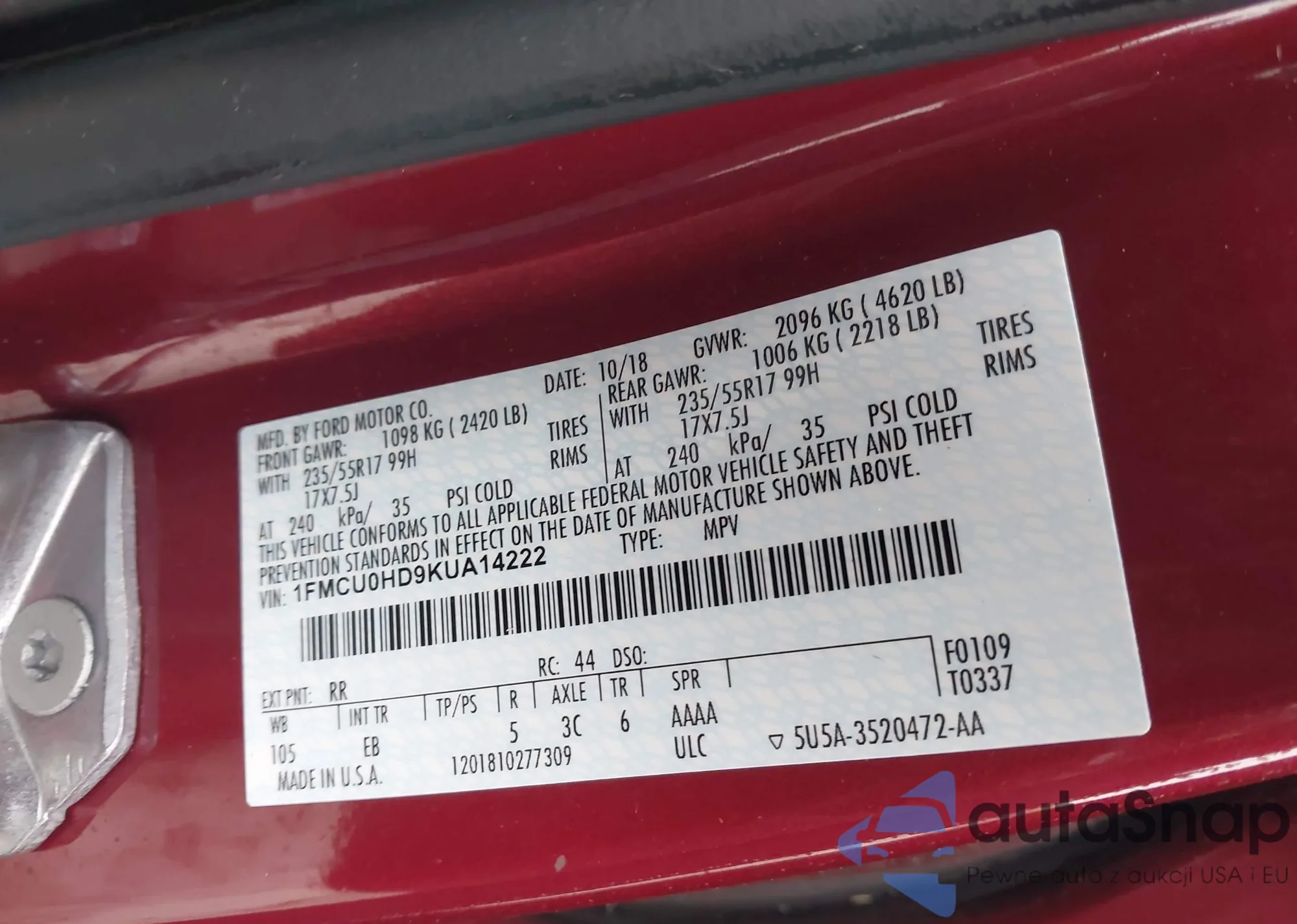 • VIN 1FMCU0HD9KUA14222