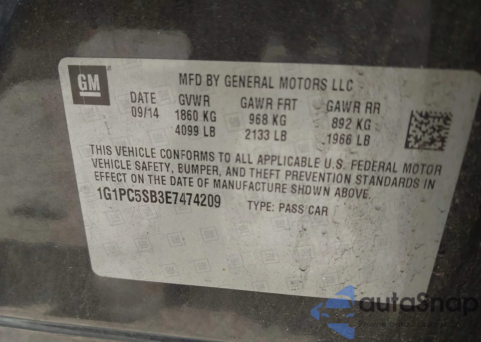LOT: 42521681 VIN: 1G1PC5SB3E7474209