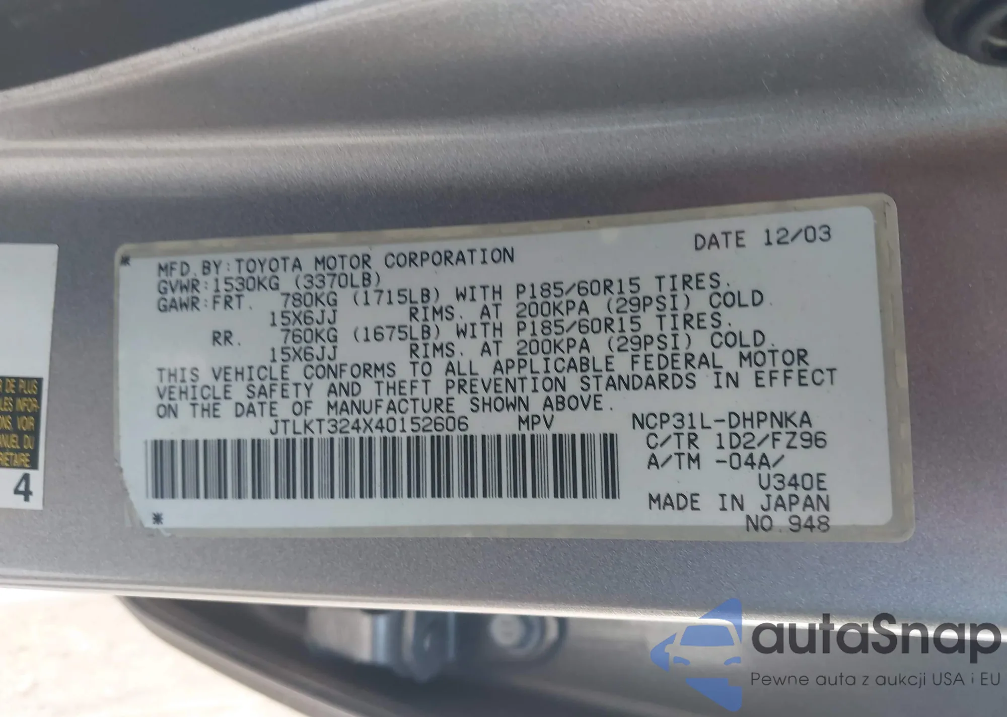LOT: 40244530 VIN: JTLKT324X40152606