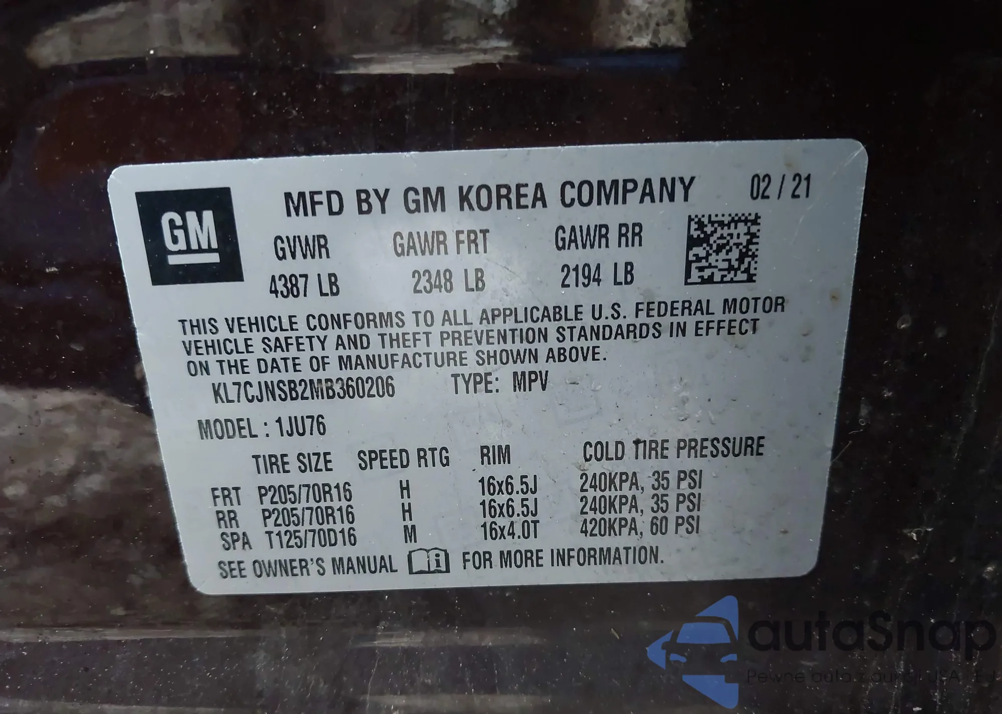 • VIN KL7CJNSB2MB360206