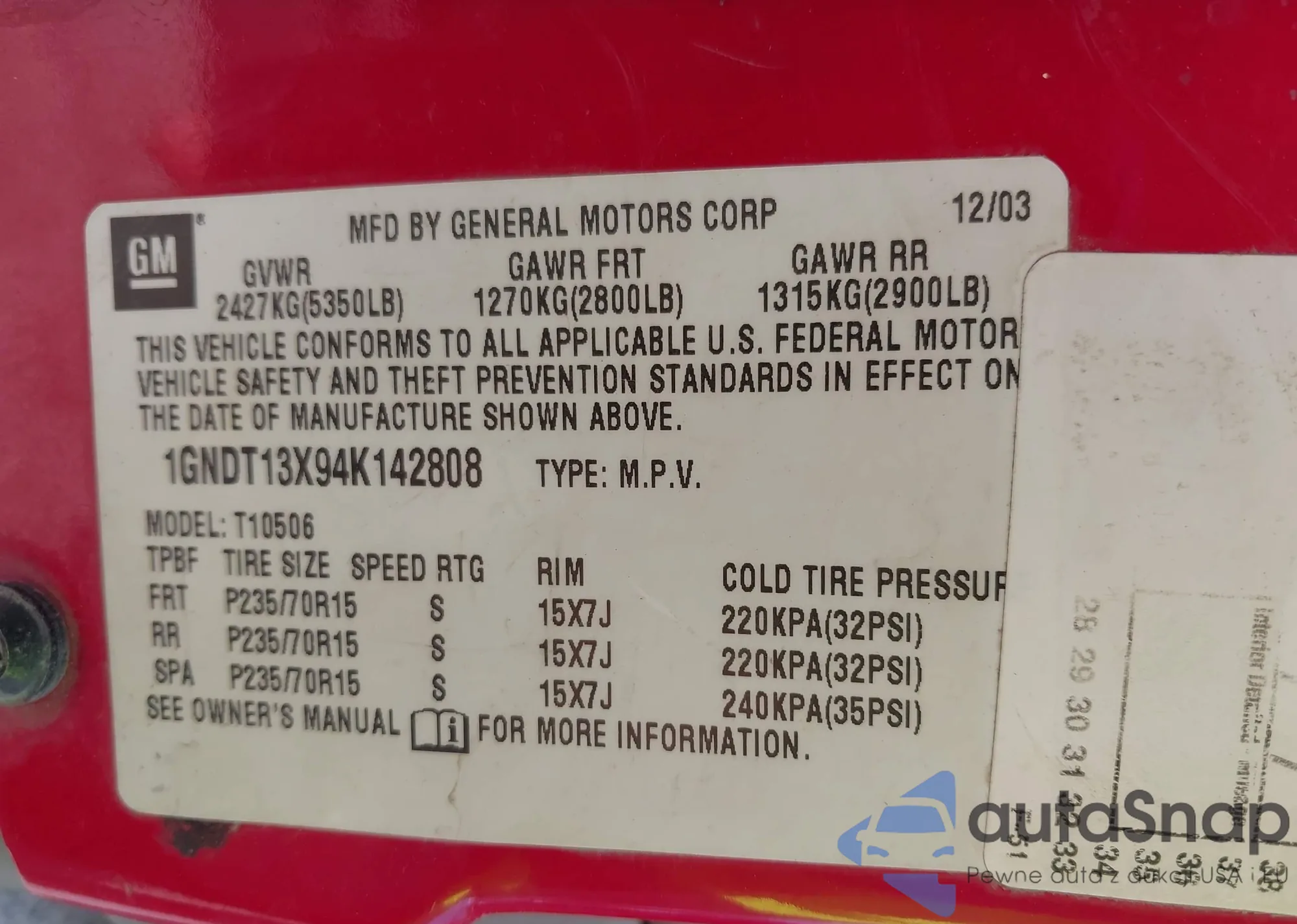 • VIN 1GNDT13X94K142808