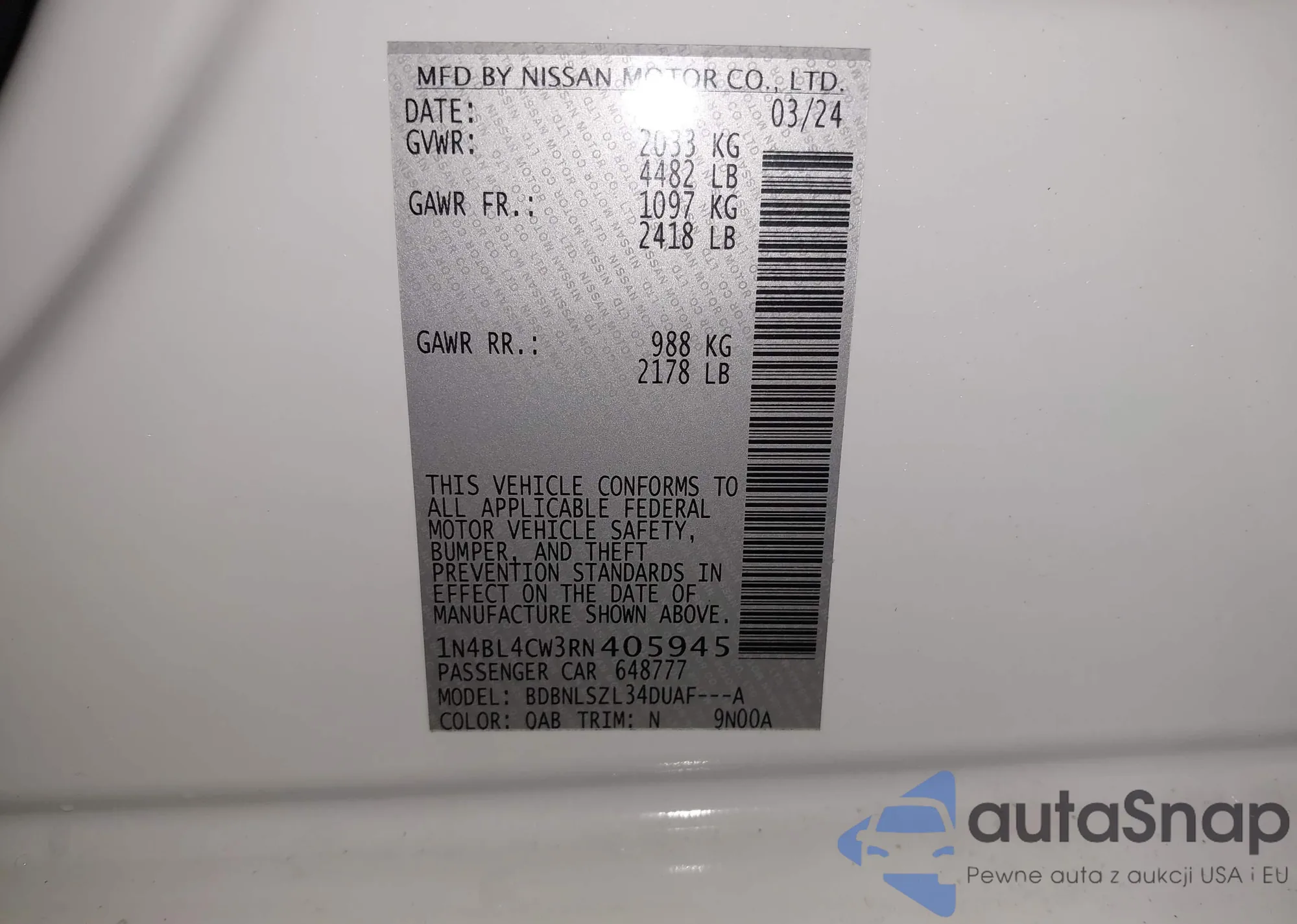 LOT: 42423261 VIN: 1N4BL4CW3RN405945