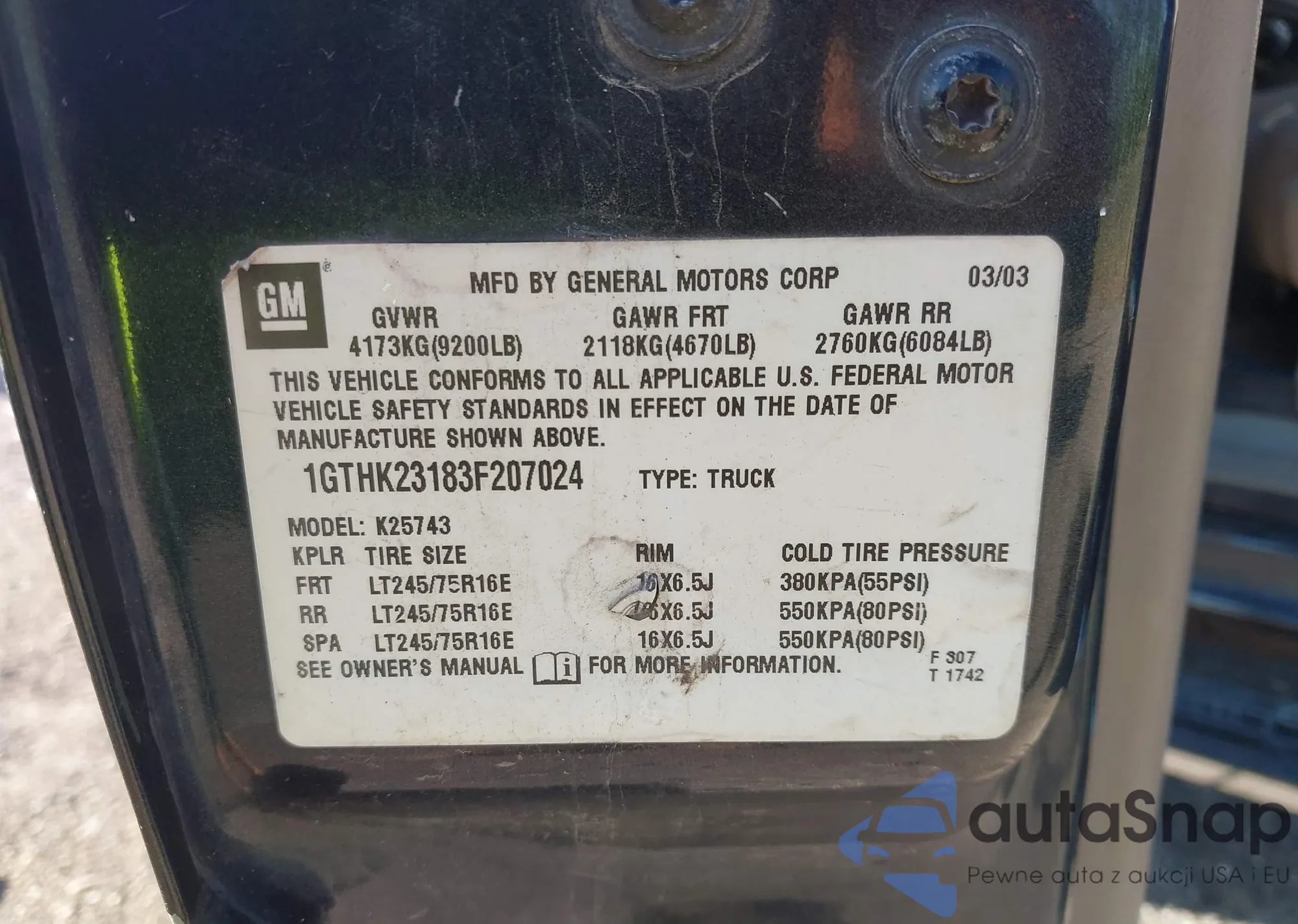 LOT: 42550100 VIN: 1GTHK23183F207024