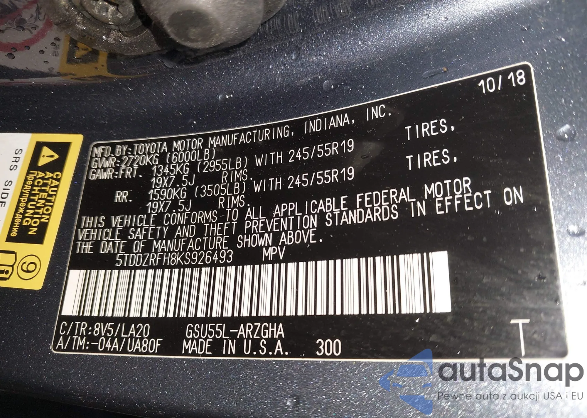 • VIN 5TDDZRFH8KS926493