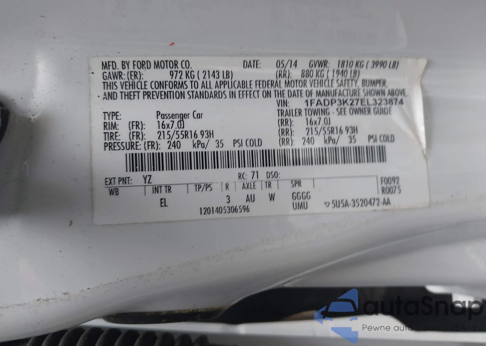 • VIN 1FADP3K27EL323874