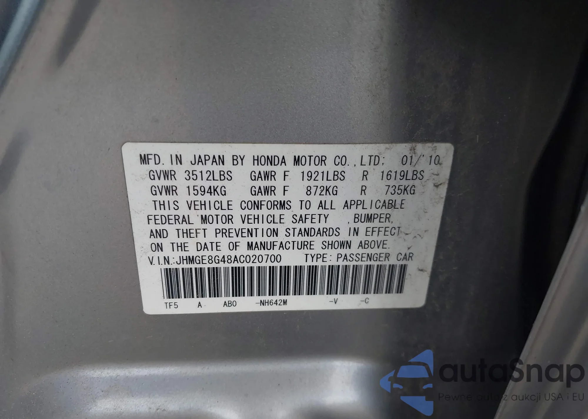 LOT: 42192130 VIN: JHMGE8G48AC020700