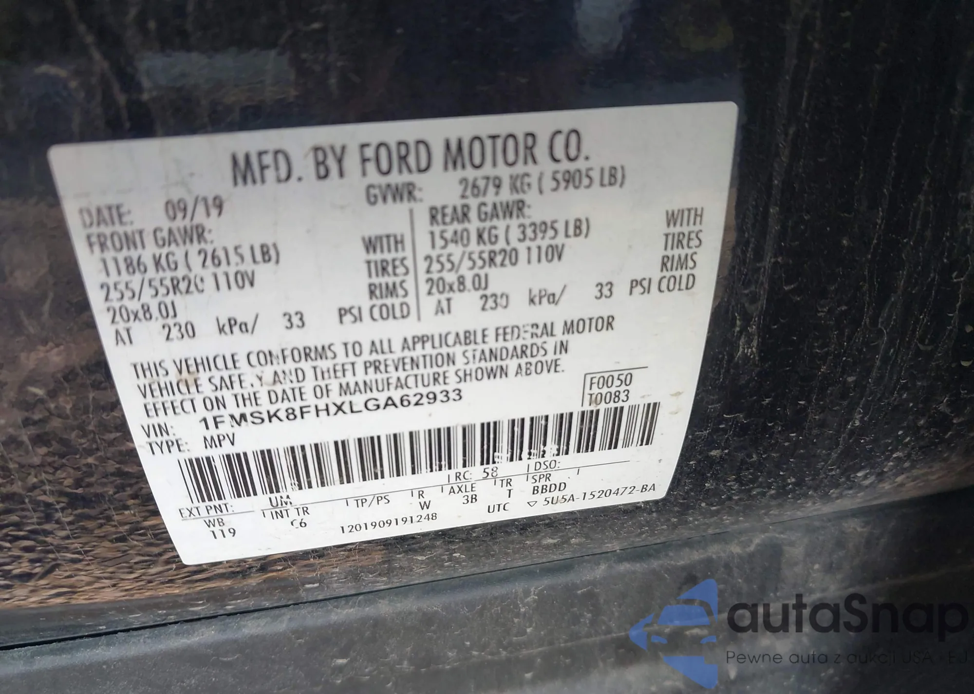 LOT: 42409662 VIN: 1FMSK8FHXLGA62933
