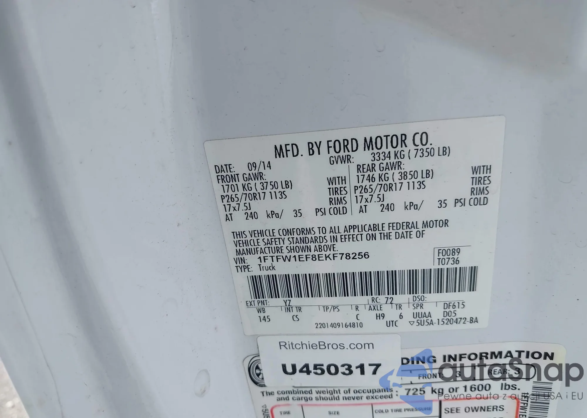 LOT: 42485237 VIN: 1FTFW1EF8EKF78256
