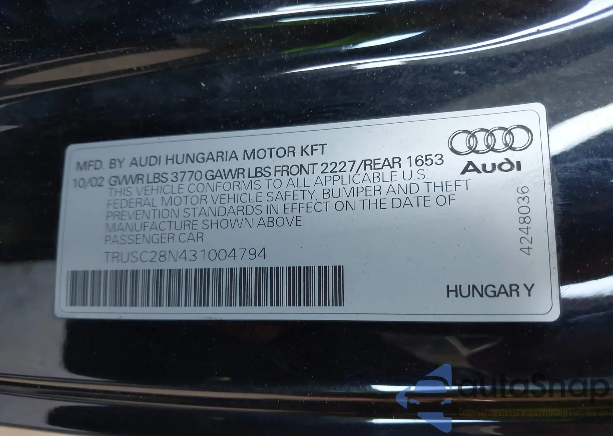 LOT: 42151503 VIN: TRUSC28N431004794