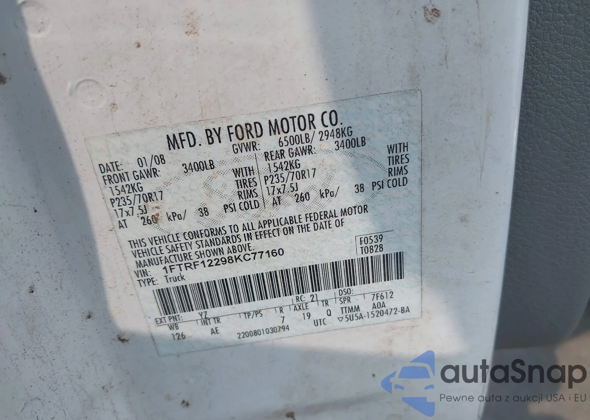 LOT: 42416447 VIN: 1FTRF12298KC77160
