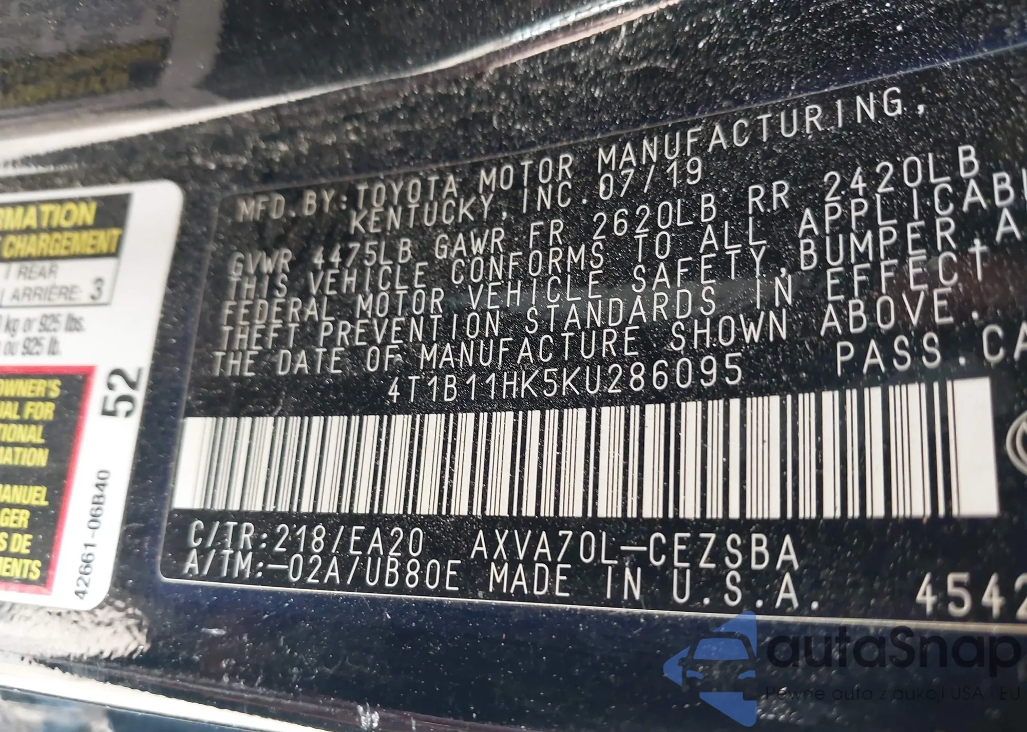 LOT: 42565371 VIN: 1N4BL4DV3KC126812