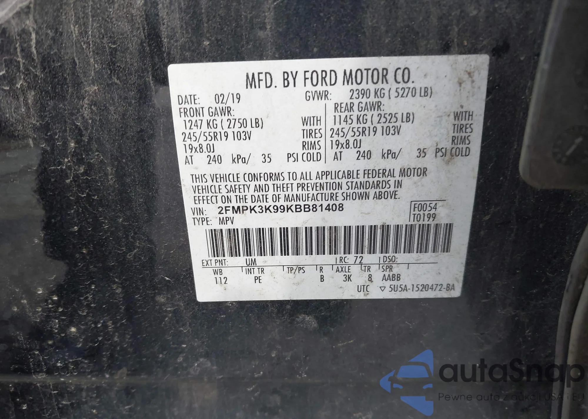 LOT: 42527685 VIN: 2FMPK3K99KBB81408