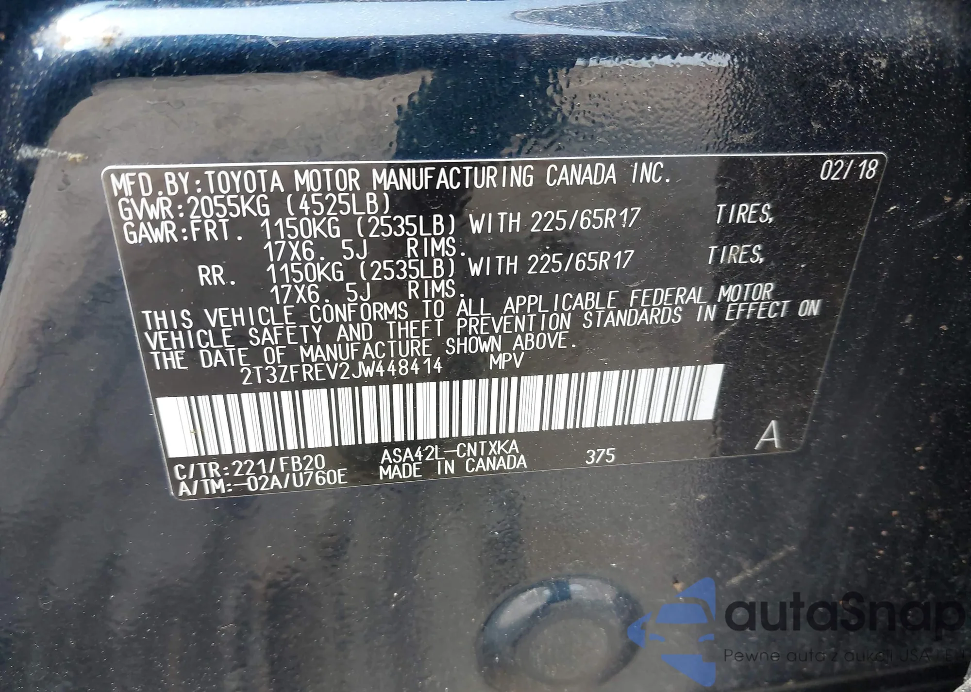 • VIN 2T3ZFREV2JW448414