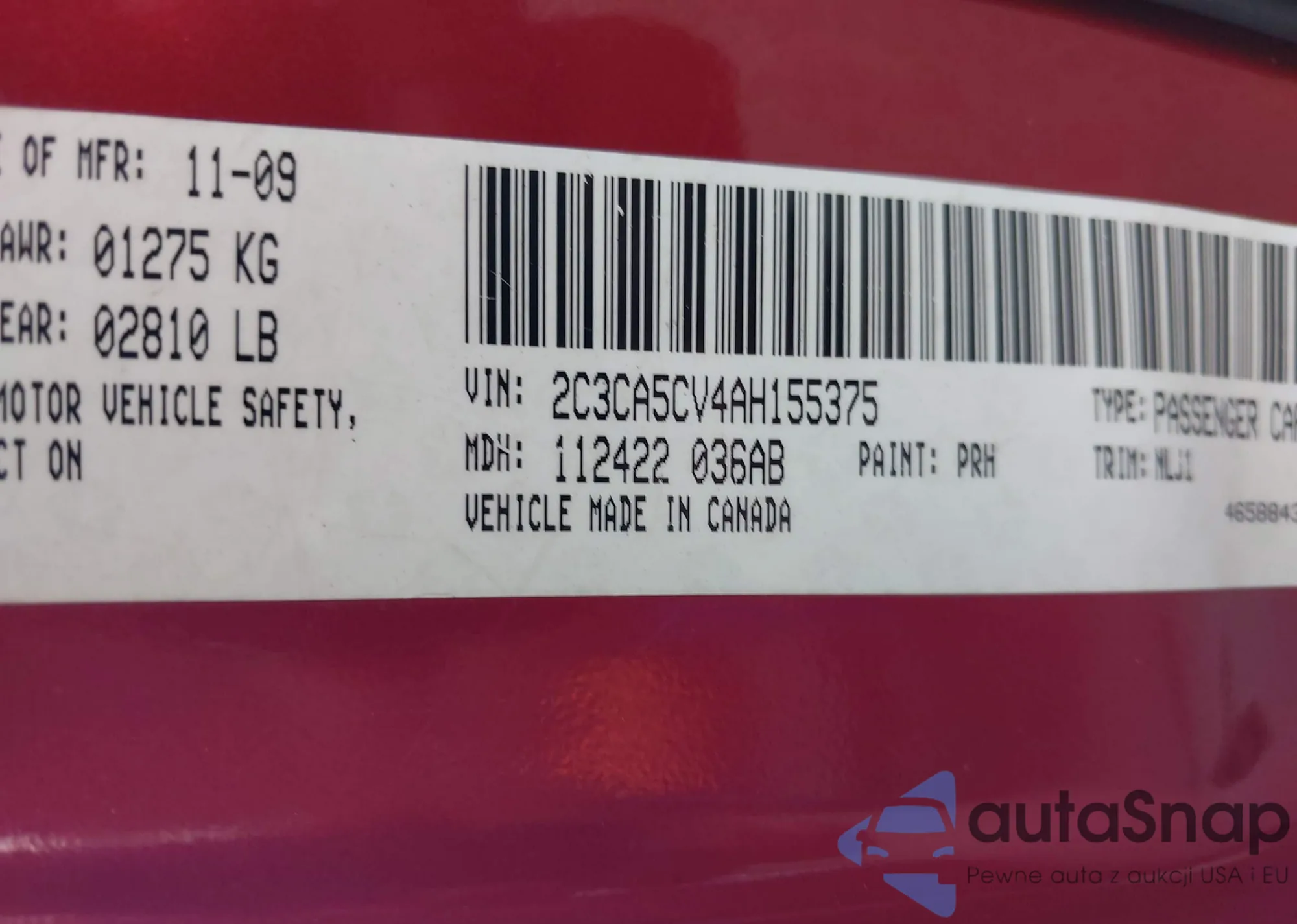 LOT: 42621975 VIN: 2C3CA5CV4AH155375