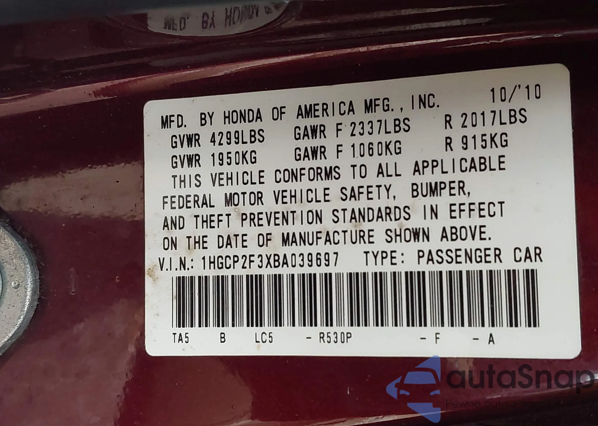 LOT: 42391454 VIN: 1HGCP2F3XBA039697