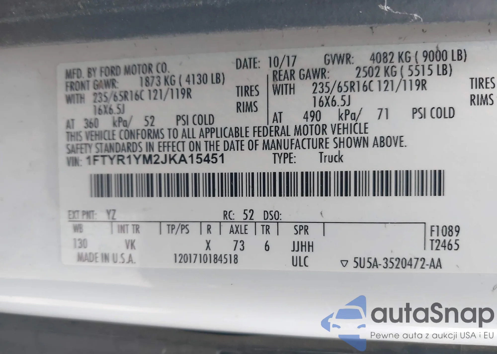 • VIN 1FTYR1YM2JKA15451