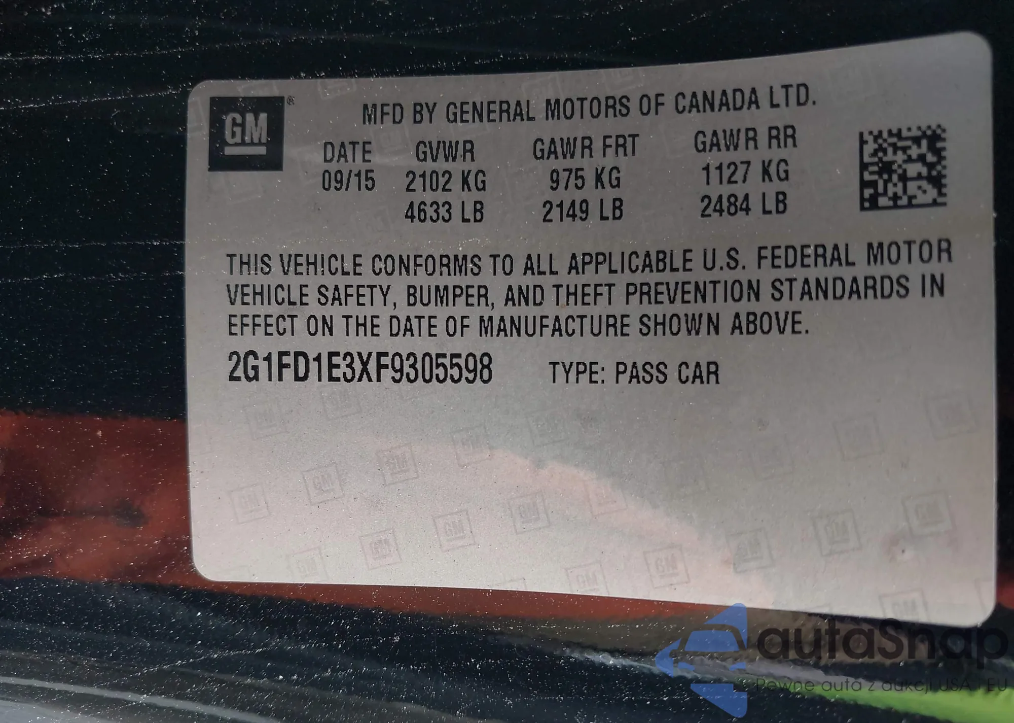 LOT: 42589749 VIN: 2G1FD1E3XF9305598